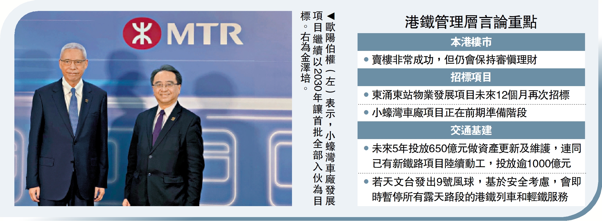 撤辣後樓市氣氛好轉,鐵路上蓋新盤銷售熾熱。港鐵(00066)主席歐陽伯權表示,港鐵旗下樓盤銷售情況令人滿意,反映樓市回暖,惟本港樓市受不同因素影響,因此繼續保持審慎理財。未來有很多新項目要處理,但有信心財政仍然穩健,並保持目前的派息政策。另外,東涌東站項目計劃未來12個月再次招標,小蠔灣車廠發展項目仍在前期籌備階段,繼續以2030年讓首批全部入伙為目標。/大公報記者 陳思華