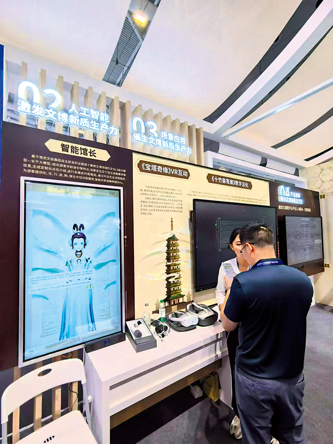 科技還讓千年佛洞煥發生機。敦煌研究院將「尋境敦煌─數字敦煌沉浸展」搬到了文博會甘肅展館現場,戴上VR設備,觀眾可身臨其境「走進」莫高窟現存最早有明確建窟紀年的石窟─第285窟,零距離觀賞壁畫。\大公報記者李望賢、毛麗娟