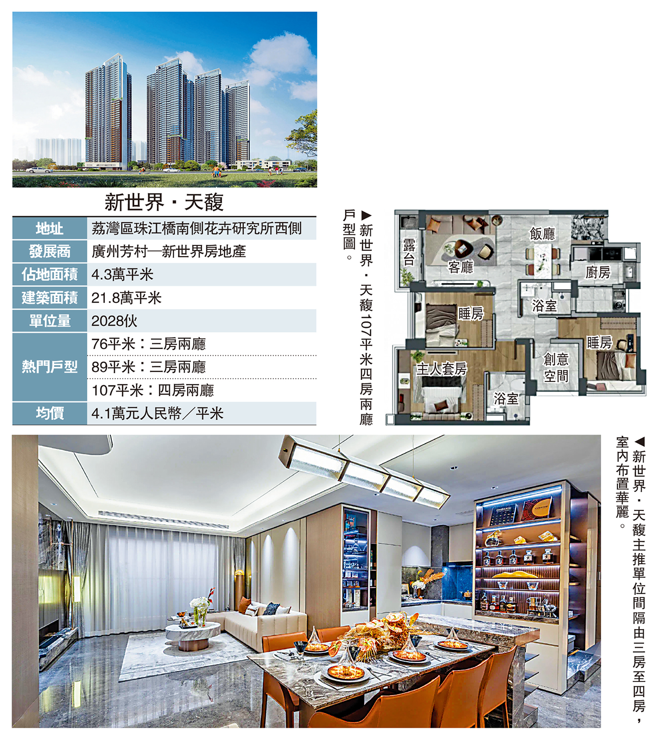 位於荔灣白鵝潭CBD的新世界·天馥,由6幢42至47層高物業組成,提供2028個單位,每平米均價4.1萬元人民幣(約4.4萬港元)。項目交通便捷,生活配套設施完善,周邊擁有優質的教育資源,受到買家追捧。