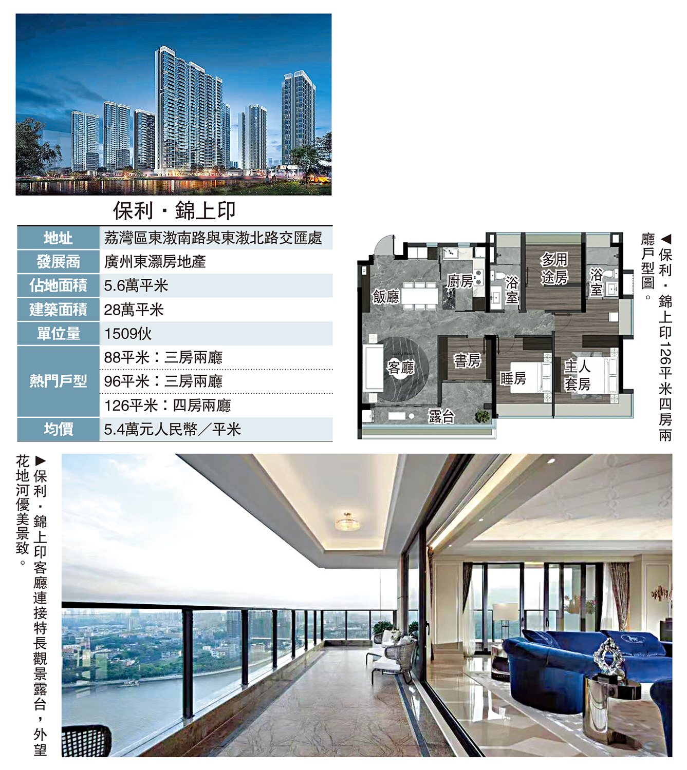 保利·錦上印受惠荔灣白鵝潭商圈建設,建築面積28萬平米,提供1509伙,每平米均價5.4萬元人民幣(約5.8萬港元)。該盤被花地河支流環繞,形成玉帶環腰天然格局,周邊配套完善,衣食住行醫教娛一應俱全。