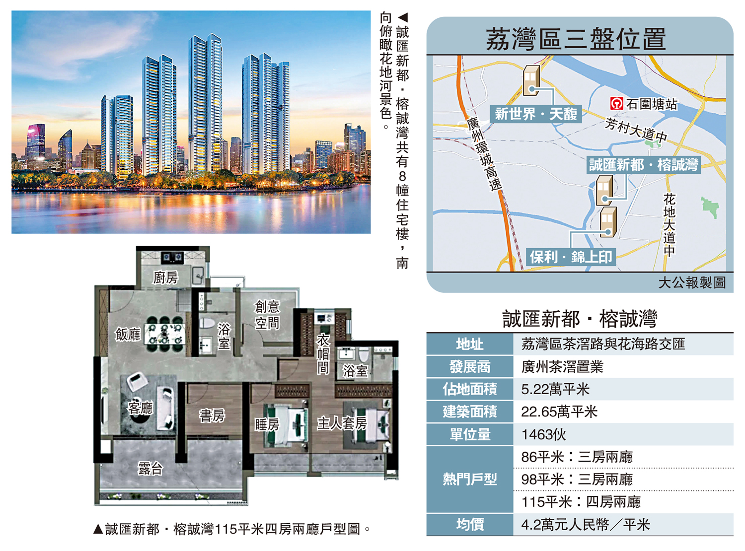 荔灣區白鵝潭為廣州五大地標商圈之一,在五一假期期間,大灣區藝術中心正式開放,吸引大批民眾參觀,入場預約一票難求;美國財政部長耶倫4月到訪廣州,也是在白鵝潭區域的白天鵝賓館出席晚宴。種種熱鬧的情景,讓買家看到白鵝潭的巨大發展潛力,誠匯新都·榕誠灣、保利·錦上印、新世界·天馥等新盤也迎來諮詢預訂熱潮。\大公報記者 帥誠廣州報道