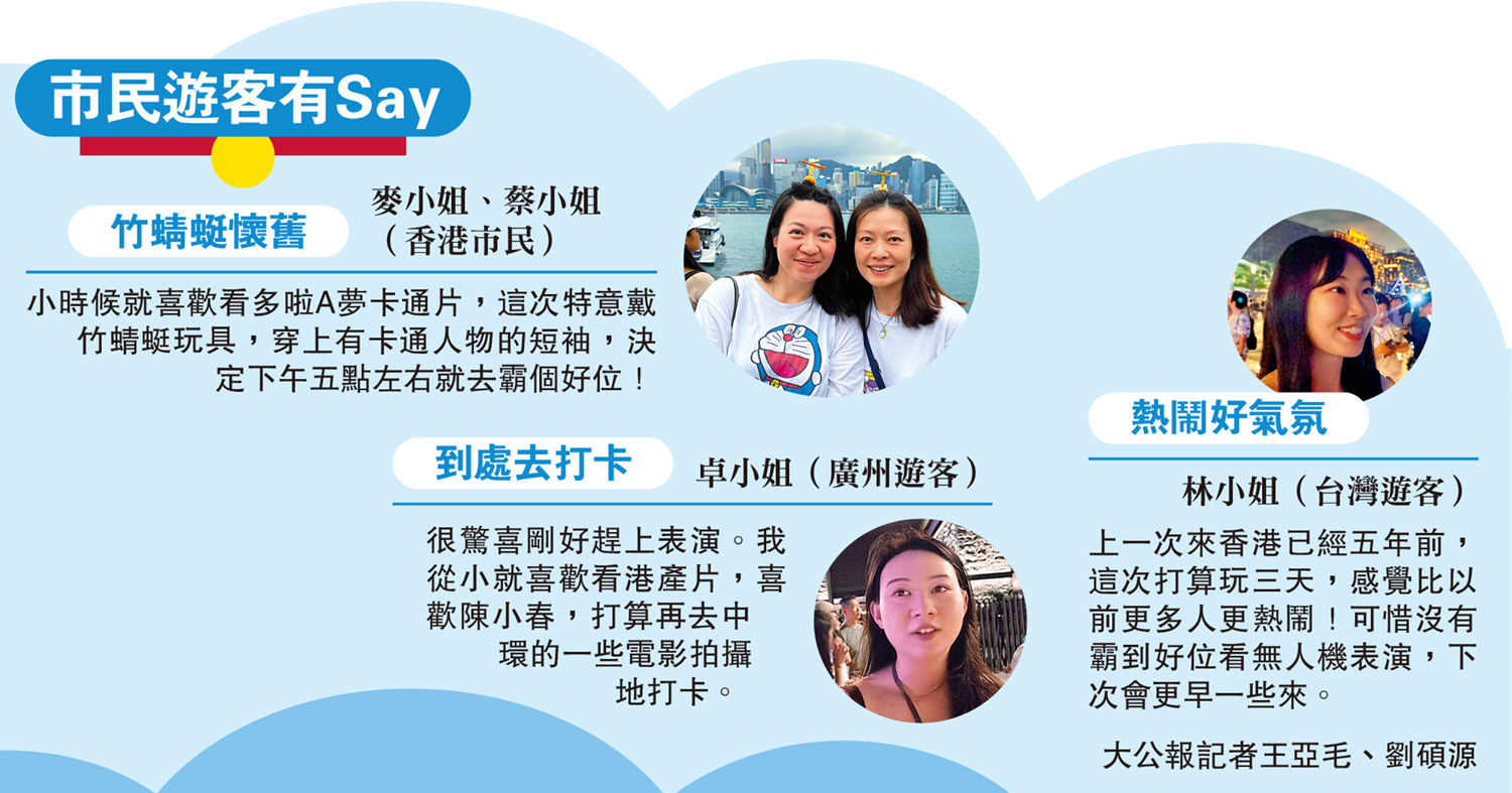 小時候就喜歡看多啦A夢卡通片,這次特意戴竹蜻蜓玩具,穿上有卡通人物的短袖,決定下午五點左右就去霸個好位!