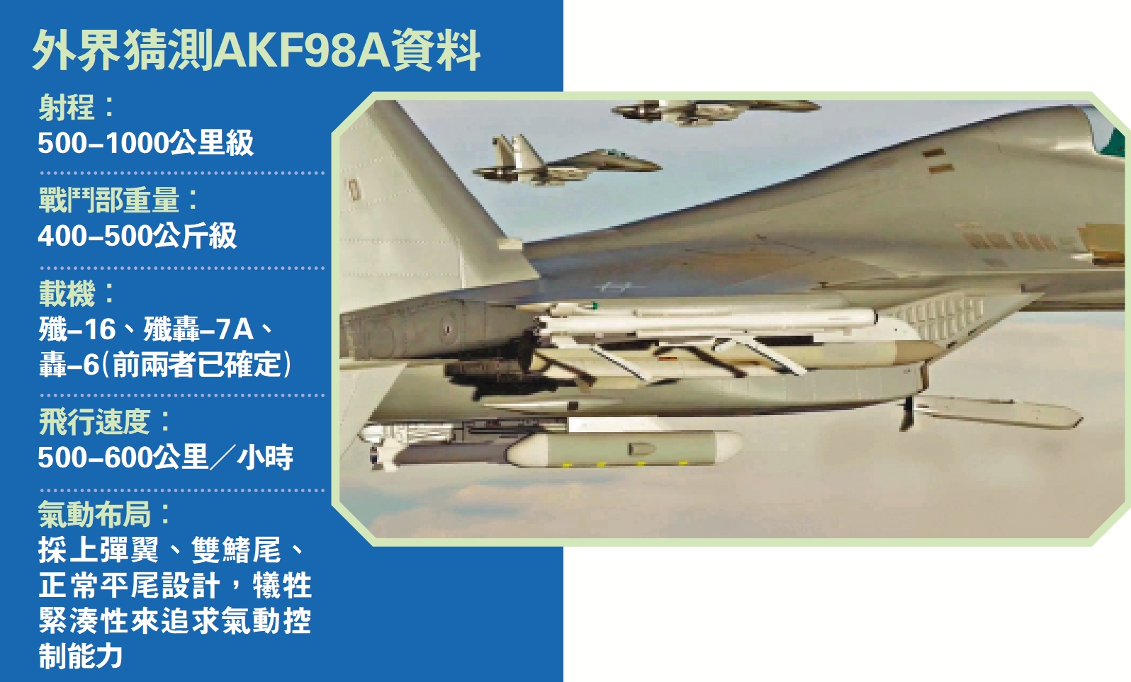 氣動布局:採上彈翼、雙鰭尾、正常平尾設計,犧牲緊湊性來追求氣動控制能力