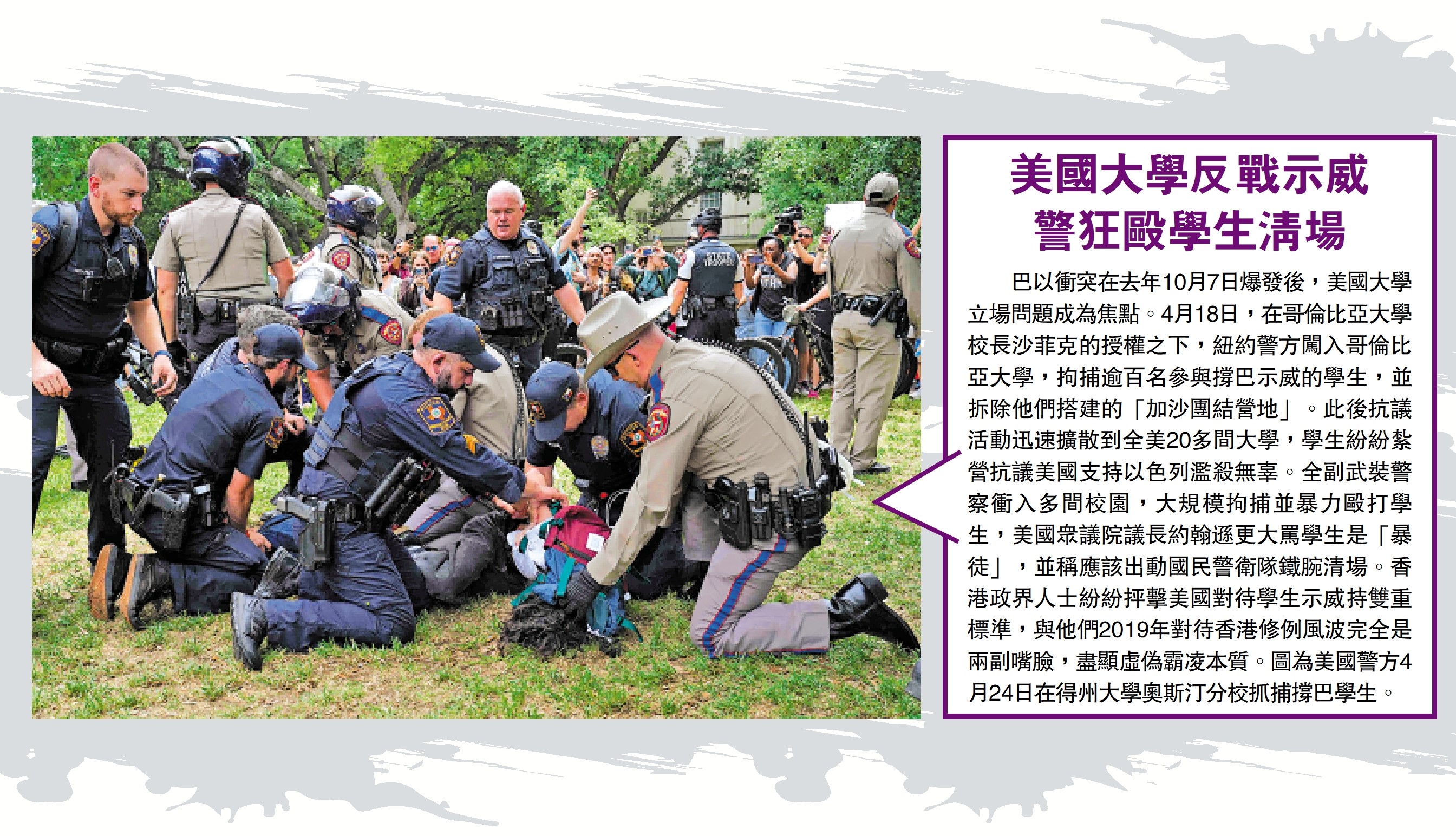 巴以衝突在去年10月7日爆發後,美國大學立場問題成為焦點。4月18日,在哥倫比亞大學校長沙菲克的授權之下,紐約警方闖入哥倫比亞大學,拘捕逾百名參與撐巴示威的學生,並拆除他們搭建的「加沙團結營地」。此後抗議活動迅速擴散到全美20多間大學,學生紛紛紮營抗議美國支持以色列濫殺無辜。全副武裝警察衝入多間校園,大規模拘捕並暴力毆打學生,美國眾議院議長約翰遜更大罵學生是「暴徒」,並稱應該出動國民警衛隊鐵腕清場。香港政界人士紛紛抨擊美國對待學生示威持雙重標準,與他們2019年對待香港修例風波完全是兩副嘴臉,盡顯虛偽霸凌本質。圖為美國警方4月24日在得州大學奧斯汀分校抓捕撐巴學生。