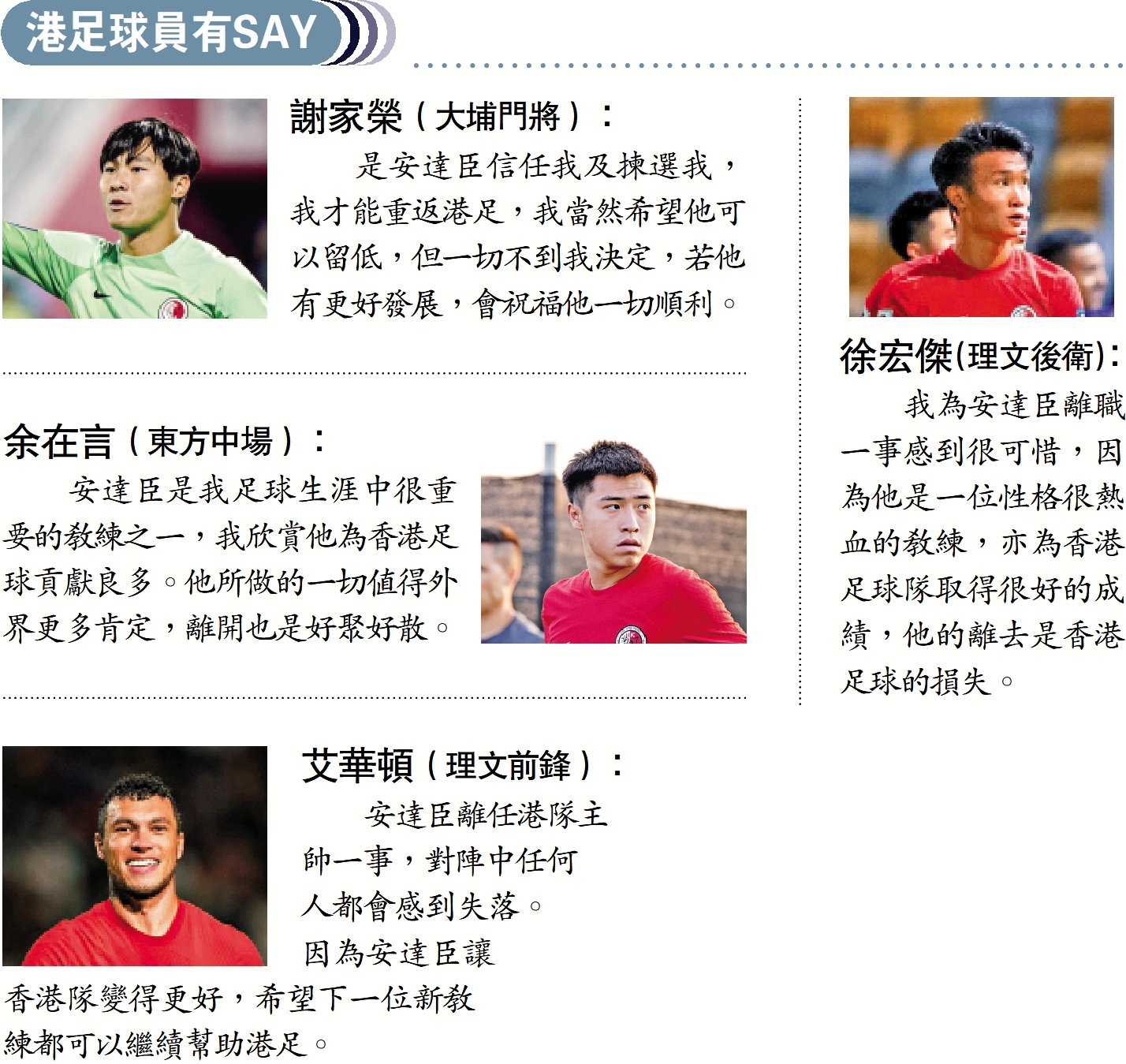 安達臣離任港隊主帥一事,對陣中任何人都會感到失落。因為安達臣讓香港隊變得更好,希望下一位新教練都可以繼續幫助港足。