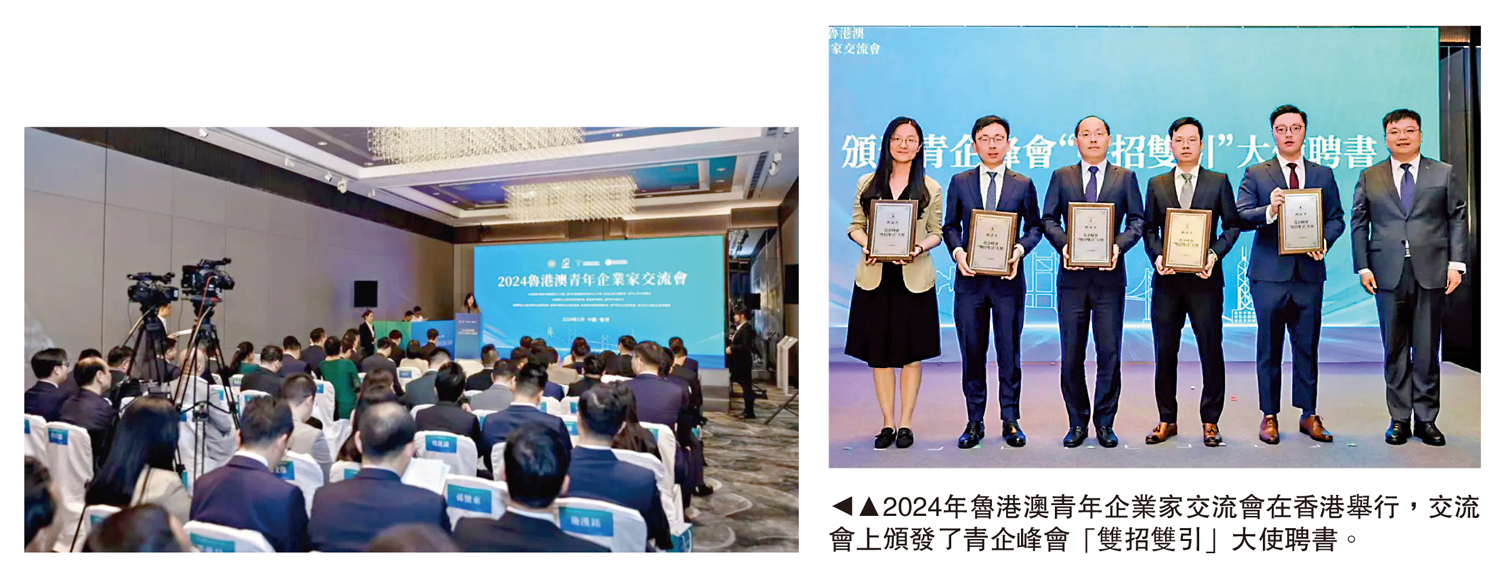 交流會上,全國政協委員、香港高鋒集團創始人兼董事局主席吳傑莊,澳門青年企業家協會常務副理事長,康健藥房連鎖創辦人兼營運總監陳錦達分別致辭,山東青年企業家協會副會長、山東恆信集團總經理司傳煜作交流發言;頒發了青企峰會「雙招雙引」大使聘書、成立了魯港澳青年科創成果轉化中心,啟動2024「港澳青年看祖國」齊魯行;山東省青年企業家協會與4家港澳青年企業家組織簽署合作協議,建立常態化合作交流機制,今後將通過互學、互訪、互助等方式,不斷深化魯港澳青年企業家交流交往。會上,同步舉辦了「新質生產力中的青年科創力量」主題分享會。