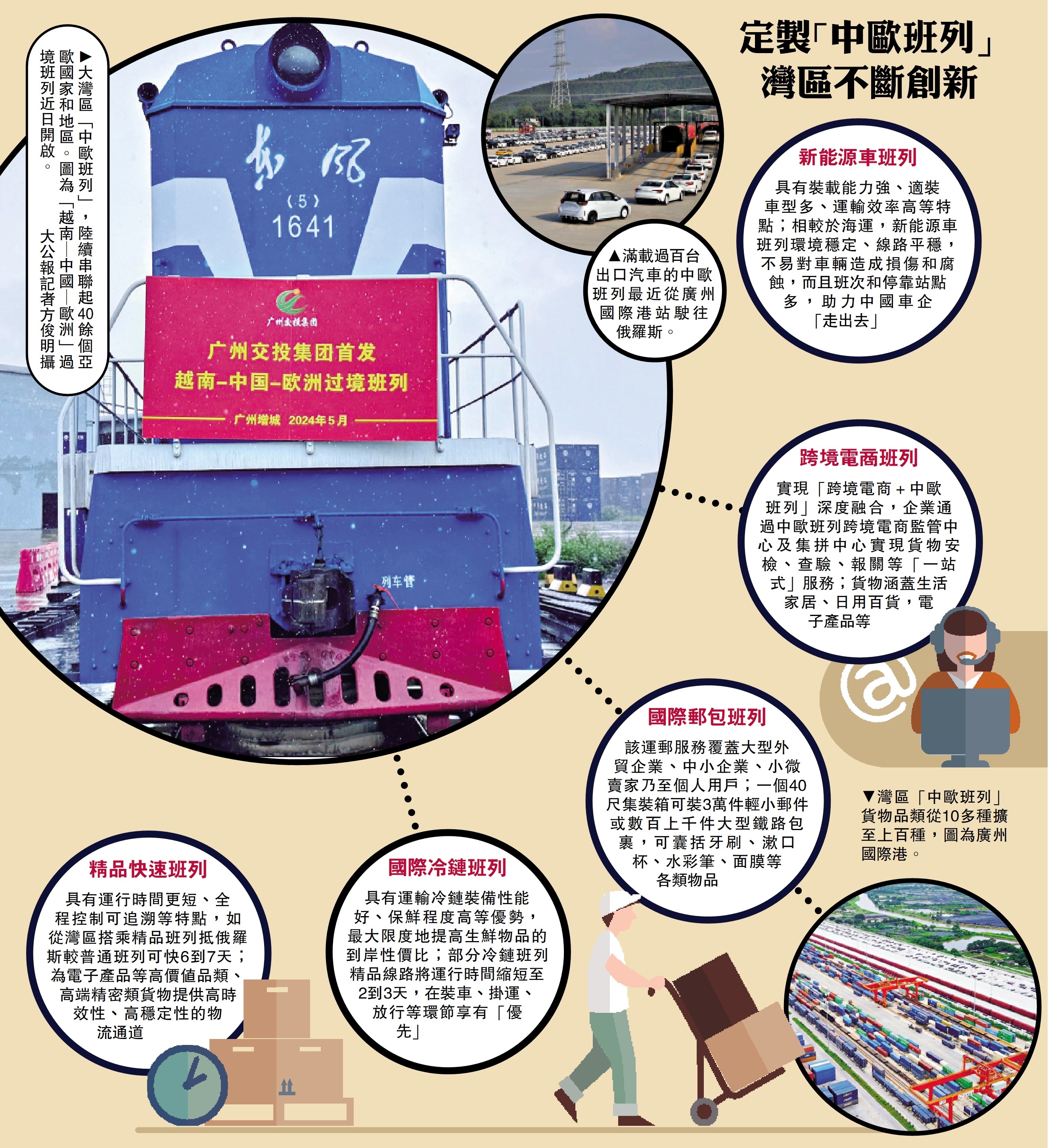 灣區「中歐班列」外拓模式多樣化!繼新能源車出口實現中歐班列「雙運載」+「雙通道」模式之後,「東南亞─中國─歐洲」過境班列亦於近日首發。廣鐵集團相關部門負責人30日受訪表示,「定製化」班列頻創新突破,涵蓋新能源車班列、跨境電商班列、國際郵包班列、精品快速班列、國際冷鏈班列等。而搭載中歐班列的「廣東造」貨物品類亦從最初的10多種擴大到上百種,當中不少是灣區知名製造品牌的貨物,高科技產品佔比逐年提升,涵蓋新能源汽車、鋰電池、光伏產品等「新三樣」,助推大灣區鏈接世界「買賣全球」。\大公報記者 方俊明廣州報道