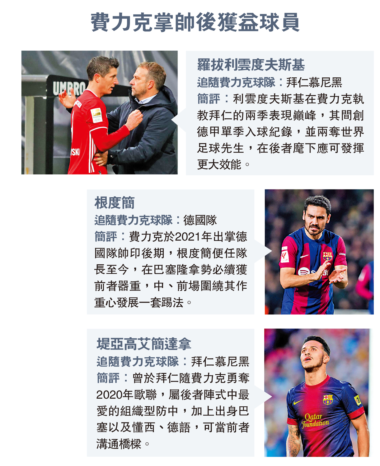 追隨費力克球隊:拜仁慕尼黑簡評:曾於拜仁隨費力克勇奪2020年歐聯,屬後者陣式中最愛的組織型防中,加上出身巴塞以及懂西、德語,可當前者溝通橋樑。