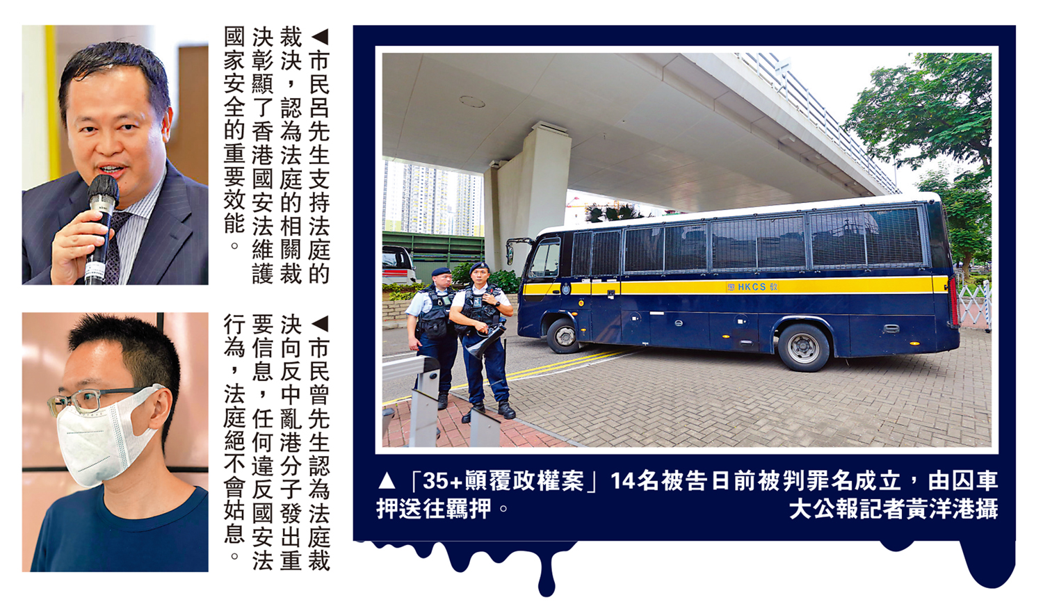 市民呂先生十分支持法庭的裁決,認為法庭的相關裁決彰顯了香港國安法維護國家安全的重要效能。他說,這些反中亂港分子提出的所謂「攬炒十步」,提出攬炒派綁架、顛覆特區政府的違法犯罪政治綱領與宣言,要利用該計劃破壞、摧毀或推翻現行的政治制度,以及香港特區根據基本法和「一國兩制」方針所建立的體制。一想起如果讓這班人得逞將給香港帶來巨大的禍害,他就感到不寒而慄。