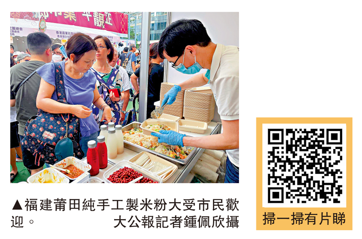 家鄉市集嘉年華的美食區內,出售純手工製的莆田興化米粉的攤位,成為人龍店。莆仙同鄉會莆田餐廳負責人朱先生昨日接受《大公報》訪問時表示,這款非遺炒米粉大受歡迎,日售近300份,他期望香港市民透過接觸內地不同省份的美食,加深認識祖國歷史文化。