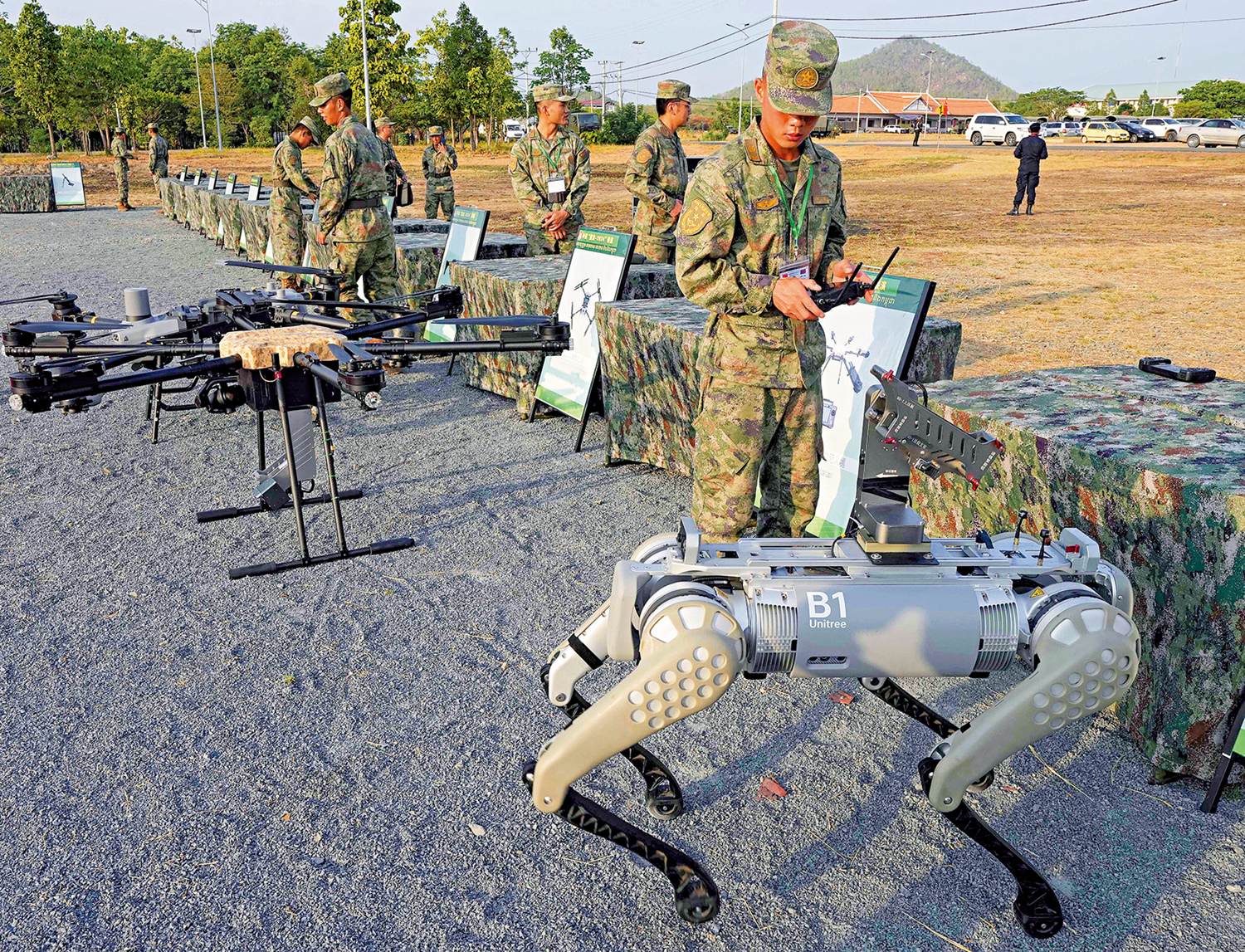 解放軍智能「機器狗」近日在中柬「金龍-2024」聯合軍演中亮相。該類四足仿生無人裝備能夠適應野戰、巷戰等各種複雜場地,敏捷完成進退跳卧等動作,遂行偵察、打擊、排爆等多樣化任務,並能根據實際需求,搭載自動步槍、火箭筒、榴彈發射器、火焰噴射器等,執行不同火力的打擊任務,以至帶頭衝鋒,在高危環境中精確獵殺目標。\馬浩亮(文)