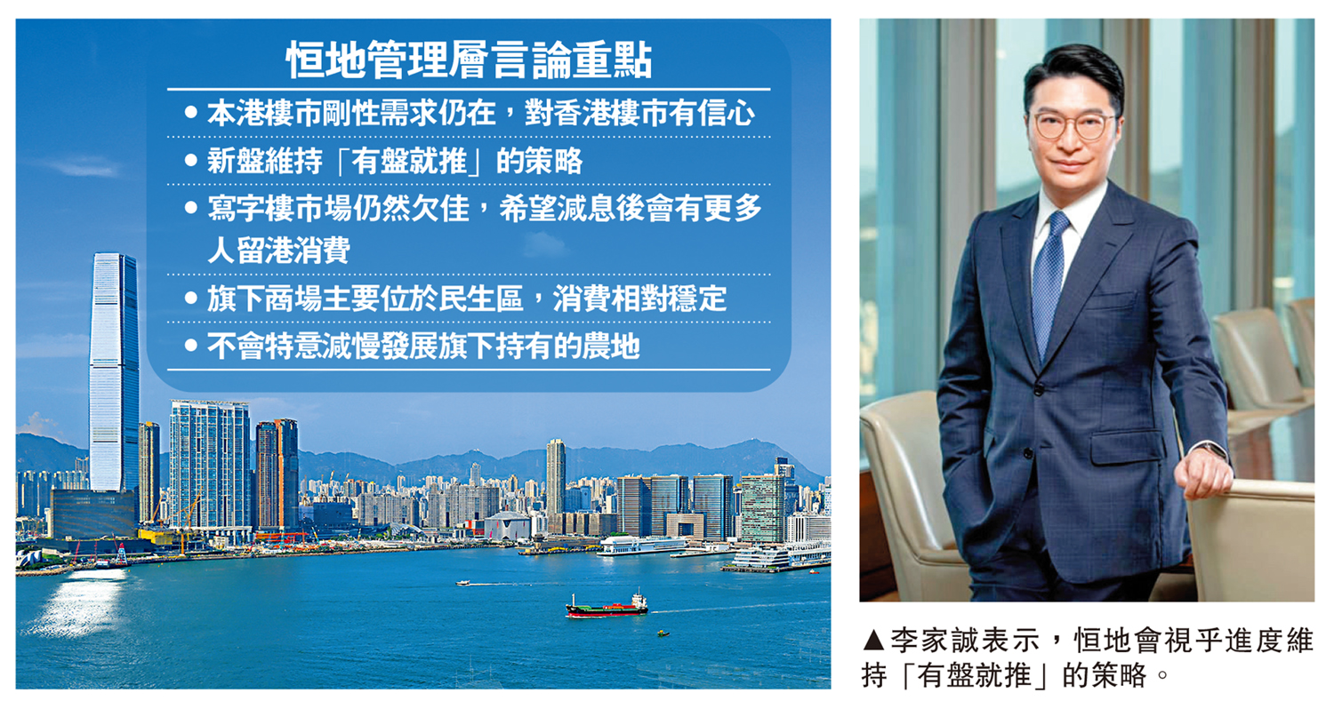 李家誠提到,近年樓市是用家當道,炒家已因先前的辣招絕跡,香港樓市剛性需求尤在。至於會否調整開盤進度,他表示,恒地會視乎進度維持「有盤就推」的策略。