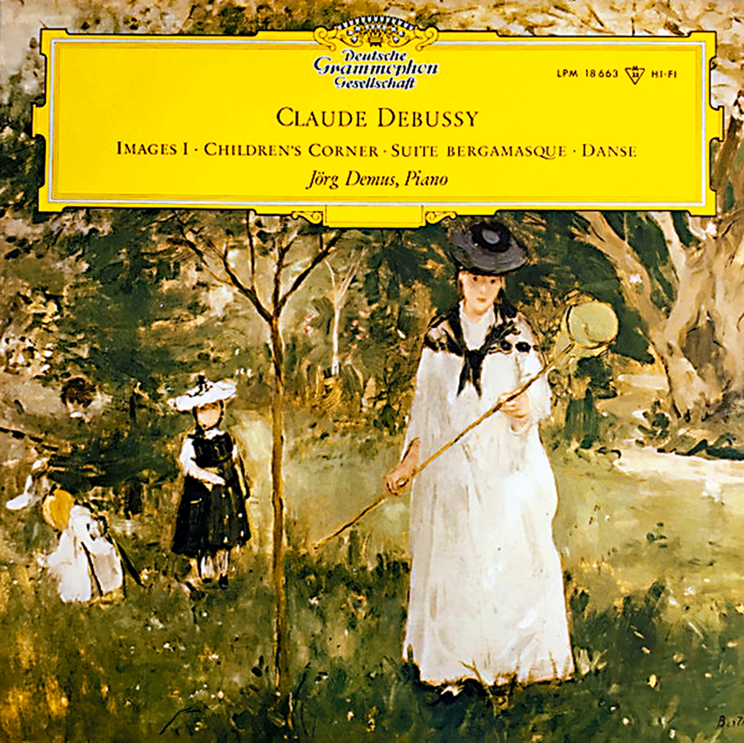 一九○六至一九○八年,十九世紀法國印象派作曲家克勞德·德彪西為其愛女愛瑪譜寫了一套共計六首的小型鋼琴獨奏組曲,名為《兒童樂園》。六首帶有標題的小曲分別是《練習曲「博士」》、《小象催眠曲》、《洋娃娃小夜曲》、《雪花飛舞》、《小牧童》和《木偶的步態舞》。剛過「六一」兒童節,本周應景地推薦一張包含德彪西這部套曲的唱片。專輯由德意志留聲機唱片公司於一九六三年灌錄並發行,收錄了《兒童樂園》套曲、《意象集Ⅰ》,以及包含名曲《月光》的《貝加馬斯克組曲》,由奧地利鋼琴家約爾格·德慕斯獨奏。唱片封套同樣配了一幅頗具童趣的畫作,出自和德彪西活躍於同時代的印象派女畫家貝絲·莫里索的《捉蝴蝶》。
