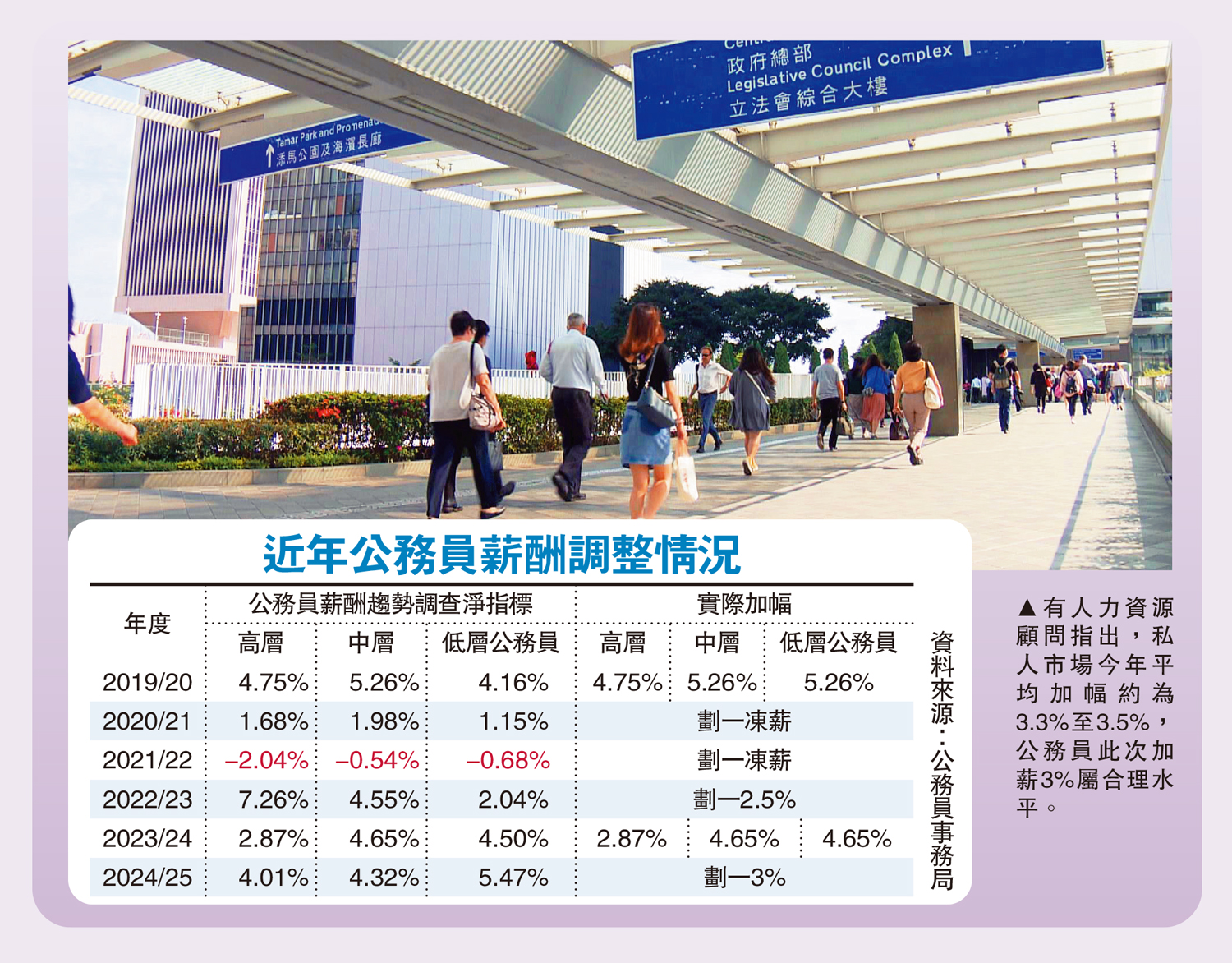 行政長官會同行政會議昨日同意2024/25年度公務員薪酬,包括首長級、高、中、低層劃一調整3%,低於薪酬趨勢淨指標,追溯至今年4月1日生效。