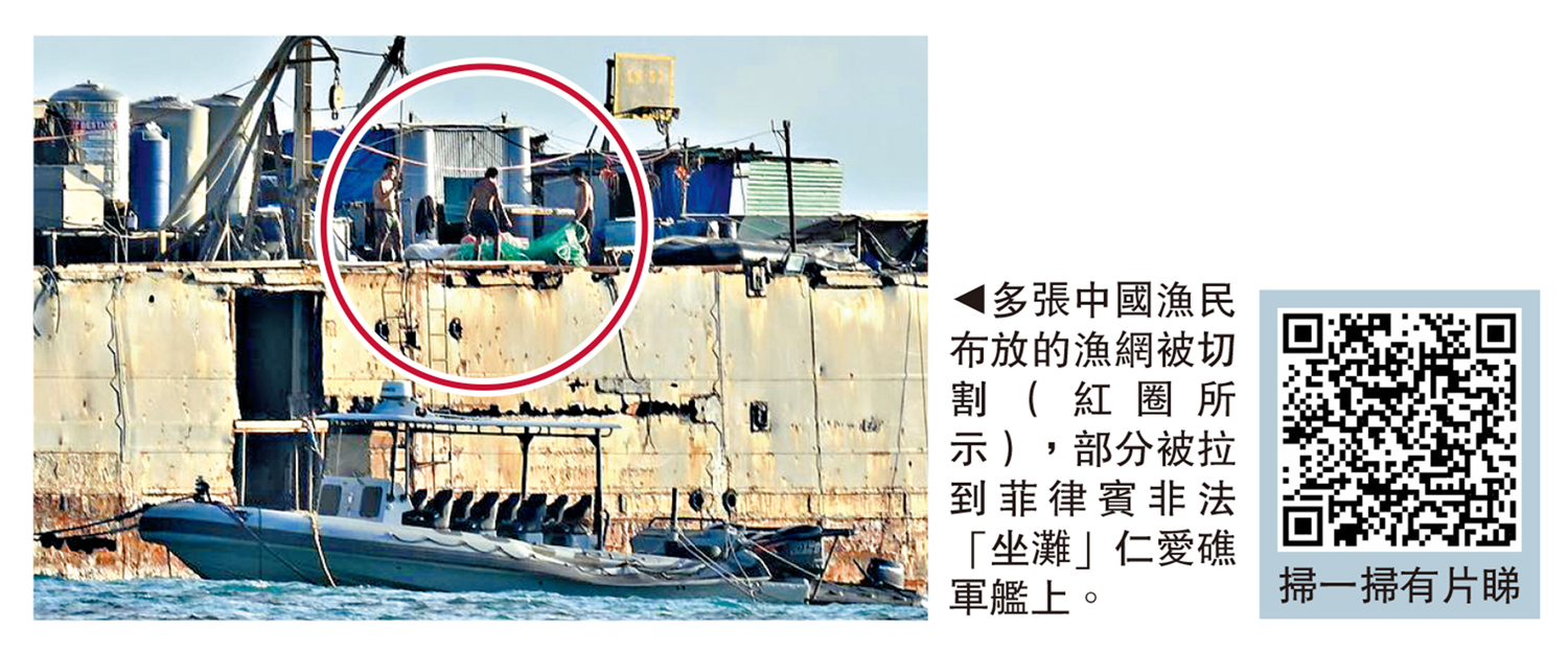 【大公報訊】據新華社報道:近日,在中國仁愛礁及其附近海域,菲律賓非法「坐灘」軍艦派出人員,破壞中國漁民所放漁網。橡皮艇返航後,菲方人員將漁網拉上非法「坐灘」軍艦。據統計,總長超過2000多米的漁網遭到破壞,多張漁網被切割,累計超過百米的漁網被拉到非法「坐灘」軍艦。作業漁網在海中呈舒展狀,而一張張遭到破壞的漁網四處散落,中國漁民將其回收。