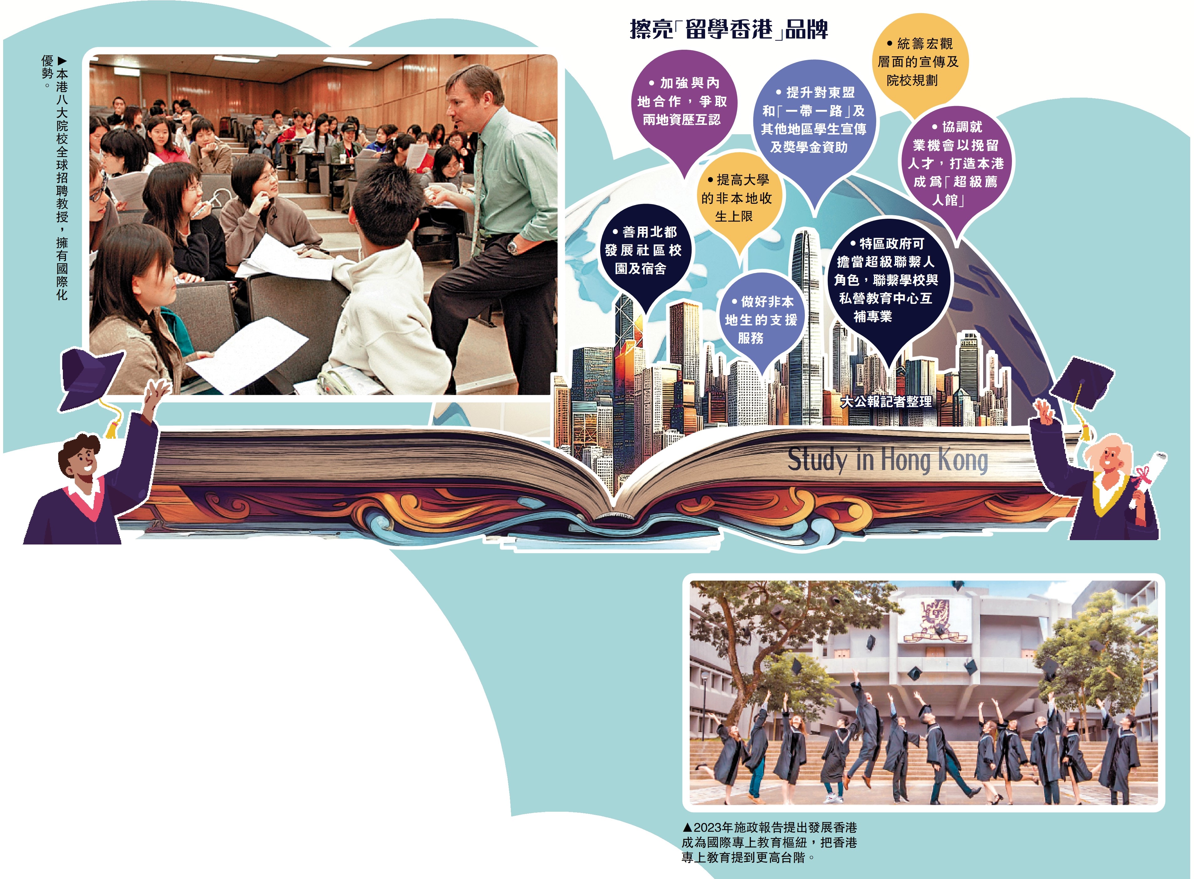 蔡若蓮表示,當局將打造「留學香港」品牌,透過多渠道推動教育高質量發展,包括加強收生,循序漸進吸引更多非本地學生;提供獎學金,擴大「一帶一路」獎學金名額。此外,會做好非本地生的支援服務,包括語言文化差異、起居飲食,以及支持其畢業後留港就業。北部都會區大學城的建設,也能助力擴大院校的空間和規模。「我們希望凝聚各院校,參加世界各地的教育展或會議,展示『留學香港』這個品牌。」蔡若蓮透露,已組織高教界到訪過澳洲,接下來將到美國、歐洲作進一步推廣。