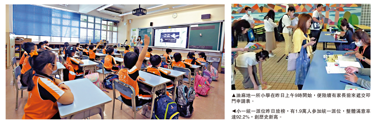 小一統一派位昨日放榜,有1.9萬人參加統一派位,整體滿意率達92.2%,創26年新高。有學生獲派第三志願,家長仍向名校叩門希望孩子能入讀區內名校,表示之前每月花費8000元供孩子參加興趣班。有高才通家長為孩子叩門心儀學校,大讚香港教育質素高。傳統名校油蔴地天主教小學將轉為小班教學,叩門位減為五個,校長余佩琴估計申請人數與去年相若,惟競爭將更激烈。\大公報記者 郭如佳