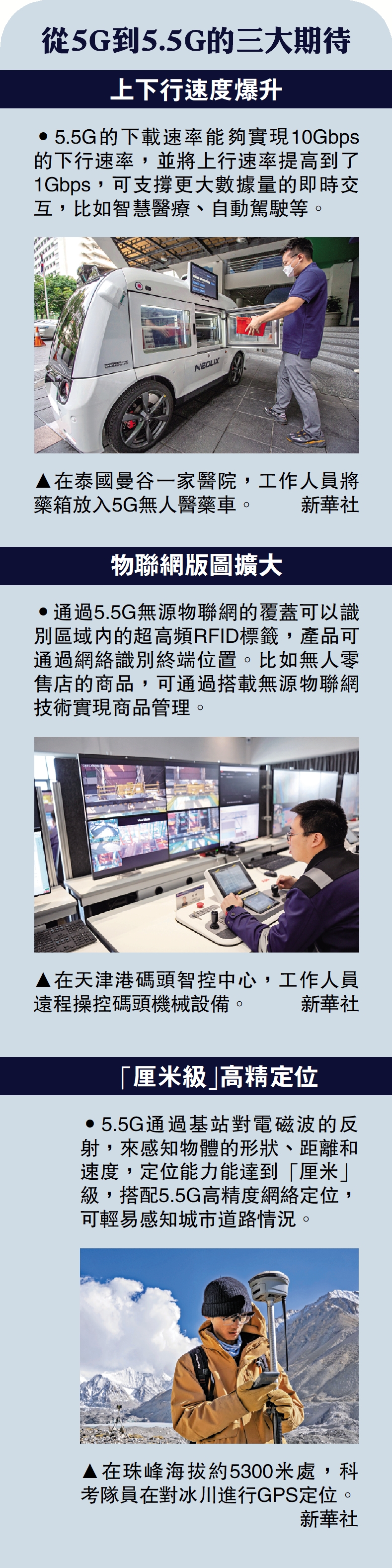 •5.5G的下載速率能夠實現10Gbps的下行速率,並將上行速率提高到了1Gbps,可支撐更大數據量的即時交互,比如智慧醫療、自動駕駛等。