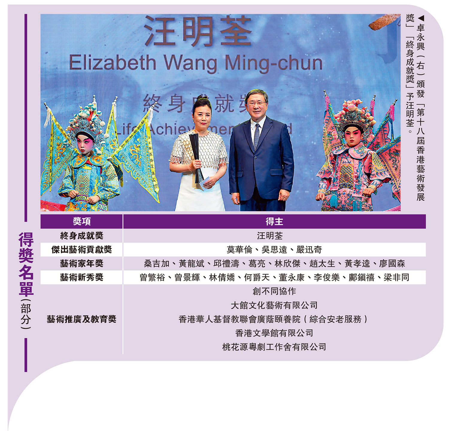 由香港藝術發展局(藝發局)主辦的「第十八屆香港藝術發展獎」頒獎禮,於昨日(11日)在香港大會堂舉行,今次頒獎禮頒發7個獎項類別、共31個獎項予本地藝術工作者、團體、學校及機構,以表揚他們在藝術方面的成就,以及在推動香港藝術發展方面的貢獻。其中最高榮譽大獎「終身成就獎」由汪明荃獲得。\大公報記者 顏 琨