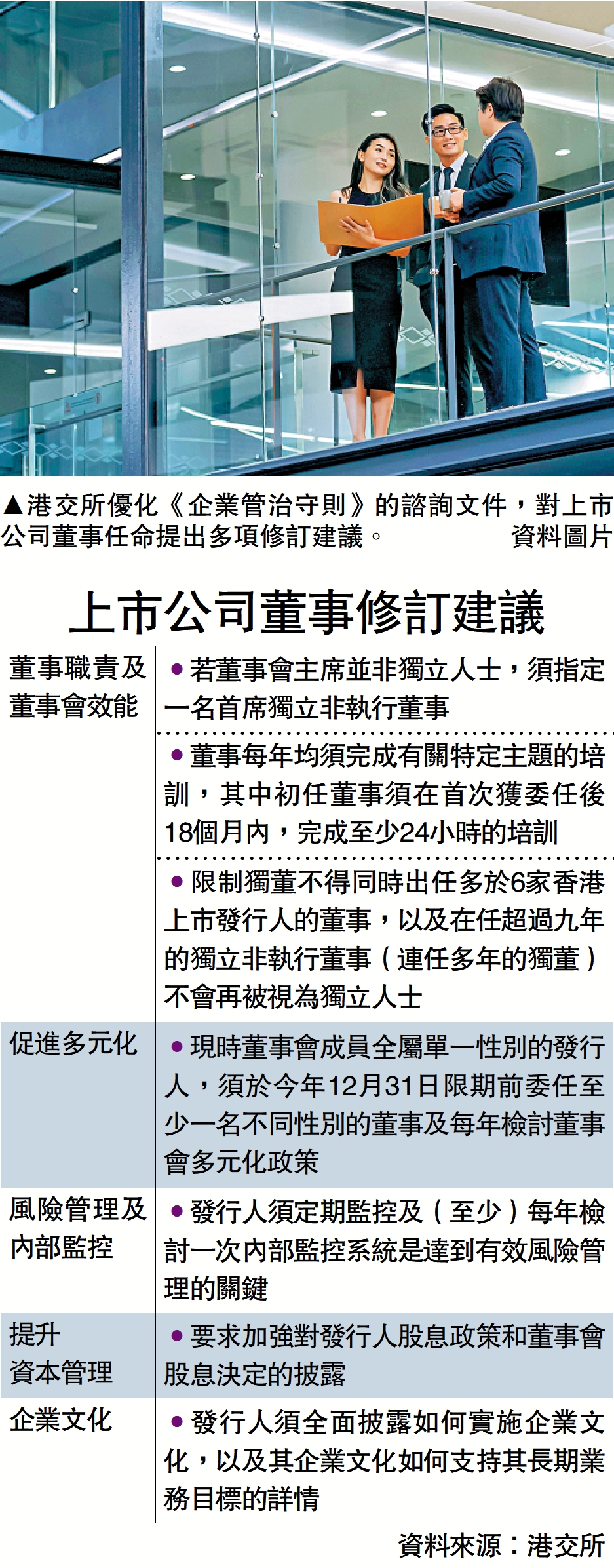港交所(00388)昨刊發有關優化《企業管治守則》的諮詢文件,對上市公司董事任命提出多項修訂建議,包括限制獨立董事不得同時出任多於6家香港上市發行人的董事、在任超過9年的獨立非執董,將不再視為獨立人士等,業界認為有助提升上市企業的透明度,有利港股市場長遠發展。\大公報記者 許臨