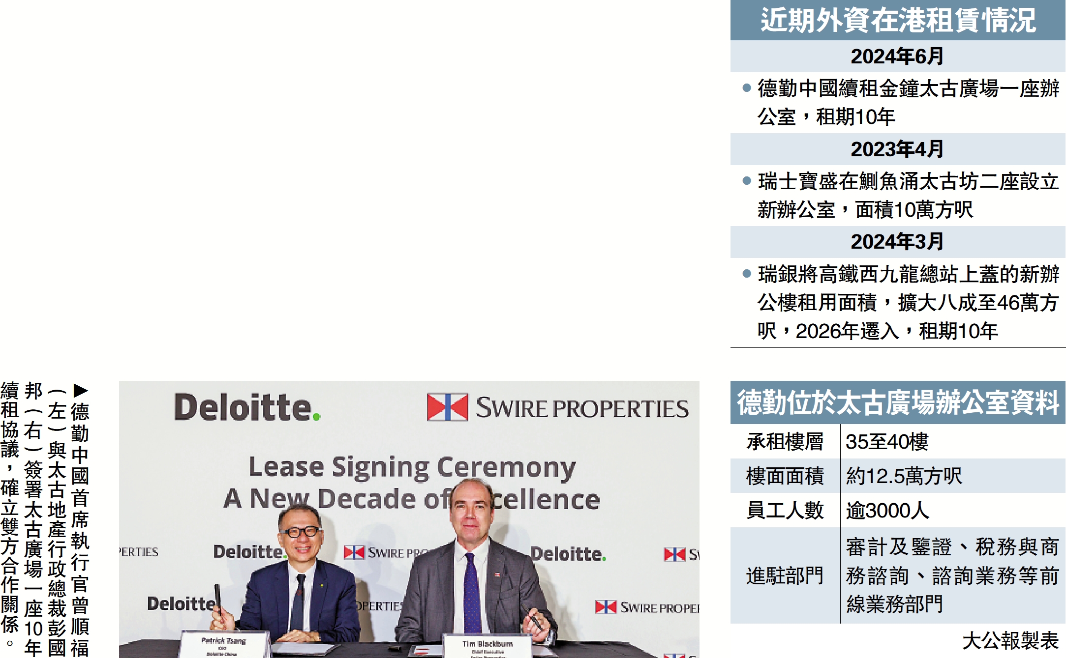 德勤中國華南區主管合夥人歐振興稱,集團與太古地產在推動香港和國家的蓬勃和可持續發展方面的共同願景,為彼此令人振奮的合作奠定了基礎,期待進一步加強與太古地產的長期成功合作關係,並攜手探索新的機遇,為香港的長期繁榮穩定作出貢獻。