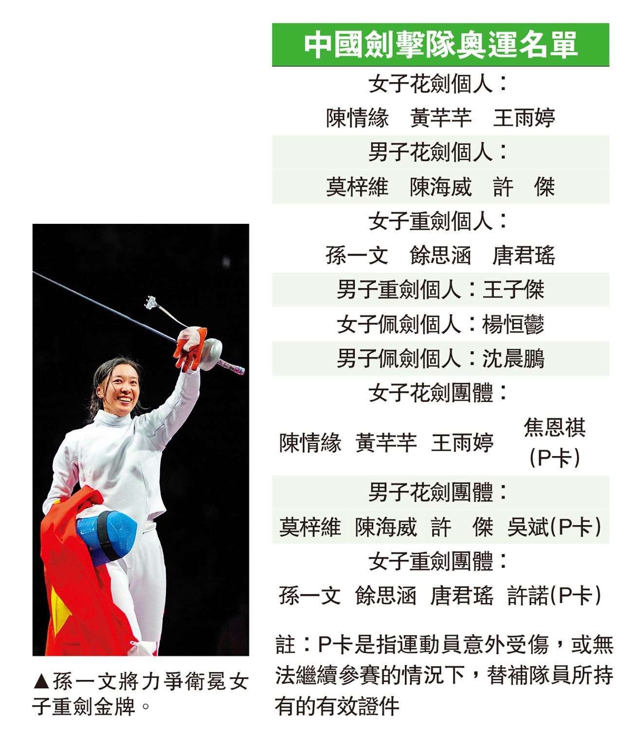 【大公報訊】據中新網報道:13日,中國擊劍隊公布了巴黎奧運會運動員參賽名單,共有24人入選(含P卡)。名單中,東京奧運會冠軍孫一文將參加女子重劍個人、團體專案角逐。