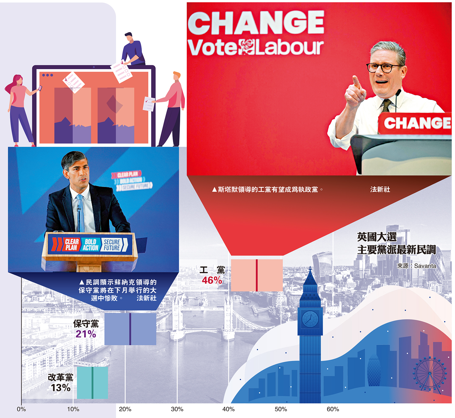 另一個由試場調查公司Savanta為《每日電訊報》進行的民調則發現,工黨46%的支持率較5日前民調上升2個百分點。同時保守黨的支持度下降至21%,比之前民調減少4個百分點。