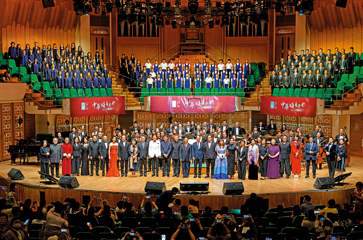 隨着兩地音樂家集體登台,深情合唱經典歌曲《歌唱祖國》,全場觀眾共同高歌,音樂會由此落下帷幕。