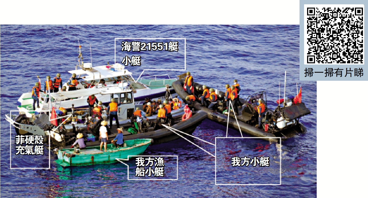 文章說,「譚主獨家獲取到了中國海警執法的現場圖片。從圖中可以看到,菲方的硬殼充氣快艇被我方多艘小艇團團圍住,接受我方的登臨檢查。」在中國海警發布的新聞稿中,與「登臨檢查」同時出現的,還有「警告阻攔」和「強制驅離」這兩項管制措施。其中,「強制驅離」這一表述是第一次出現。