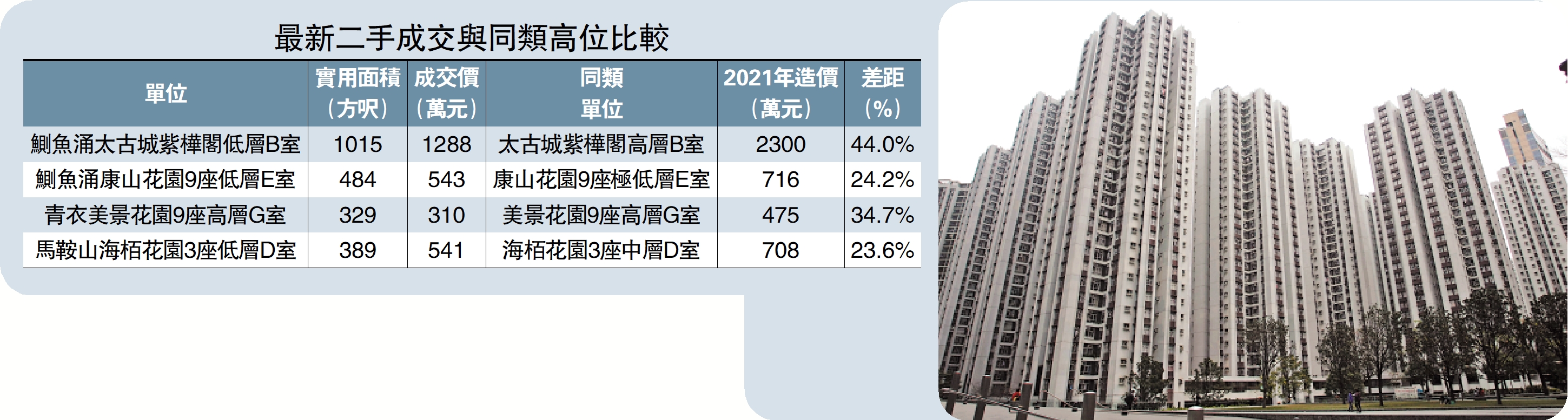 翻查成交紀錄,太古城紫樺閣高層B室,無論面積或間隔均與上址一樣,但單位可飽覽海景,於2021年10月樓市高峰期以2300萬元成交,實用呎價達22660元。撇開樓層和景觀因素,今次剛成交的低層單位造價較高位低1012萬元或44%。
