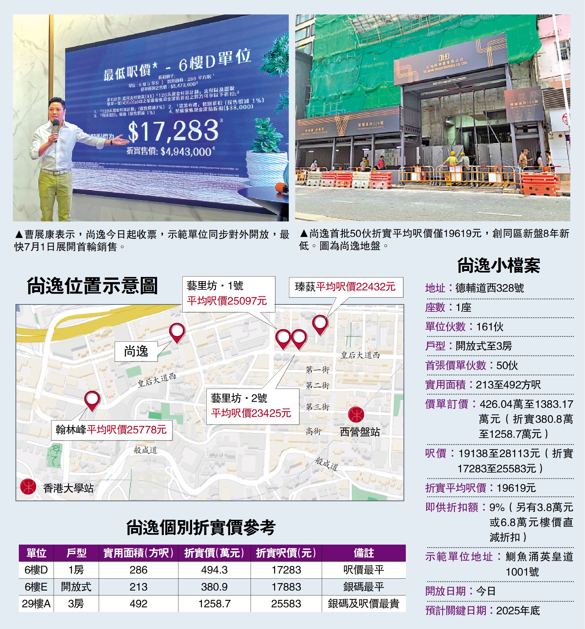 新盤交投氣氛回歸淡靜,新盤不但低價出擊,更推出買樓送車優惠加強號召力。大鴻輝旗下西營盤單幢盤尚逸,首批50伙折實平均呎價僅19619元,創同區新盤8年新低,折實入場約380萬元,買家更有機會獲贈1個價值約400萬元的開放式單位,發展商形容為「得一想二價」。示範單位今日開放兼收票,最快7月1日開賣。\大公報記者 梁穎賢