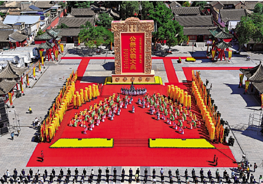 上午9時50分,公祭伏羲大典在天水市伏羲廣場正式開始。祭祀現場,鼓聲雄渾,鐘磬悠揚。台上,演員們手持八卦鼓、古琴等道具表演;台下,手舉龍旗寶蓋的儀仗隊分列兩側。樂舞告祭後,海內外代表有序進入伏羲廟,向伏羲聖像敬獻花籃,行鞠躬禮。