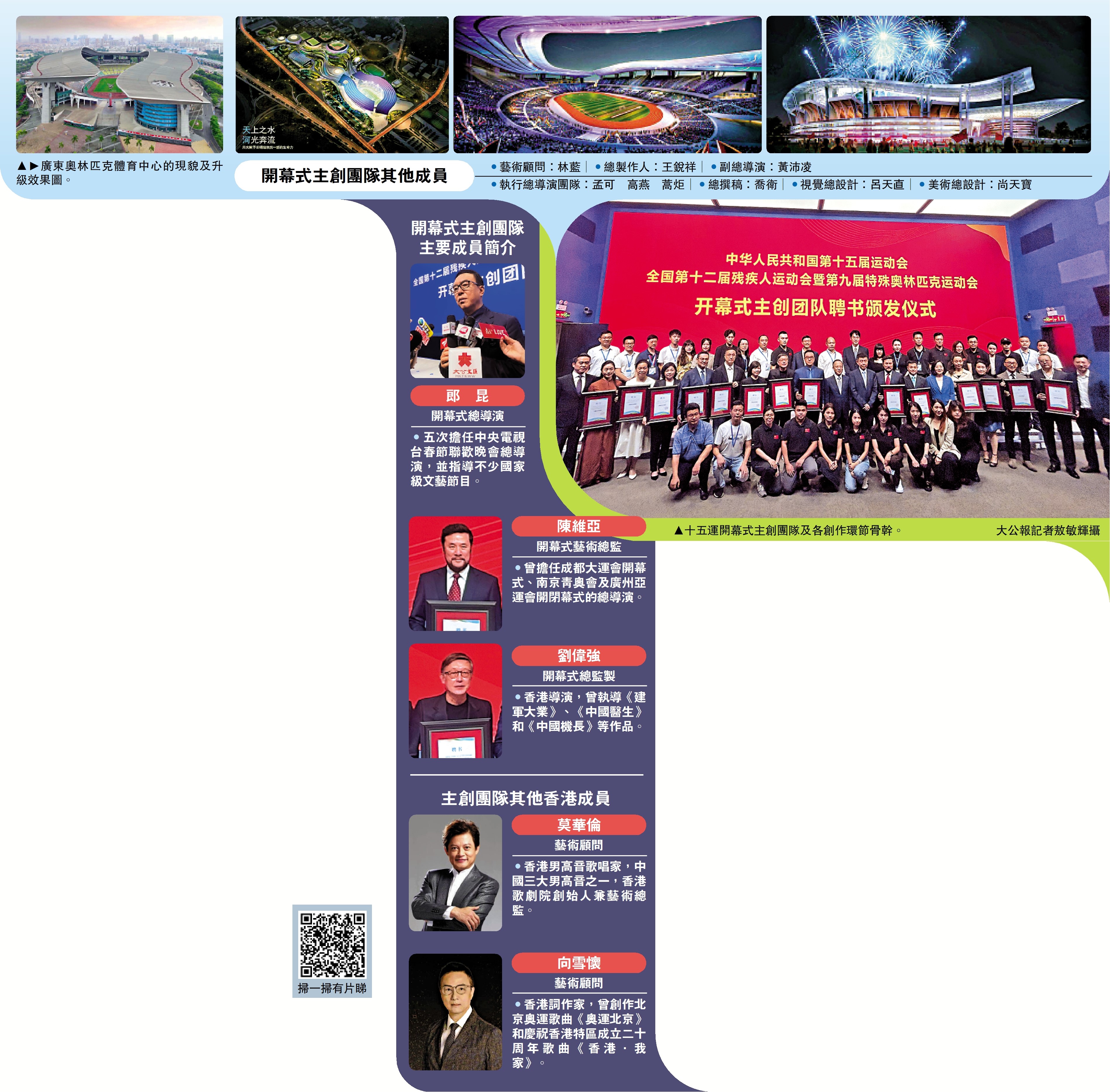 十五運會和殘特奧會是粵港澳三地首次聯合承辦的大型綜合性體育賽事,十五運開幕式將於2025年11月9日在廣州舉行,經過全面考察和幾經優選,十五運執委會負責人介紹了開幕式主創團隊由總導演郎昆、藝術總監陳維亞、總監製劉偉強,以及藝術顧問莫華倫與向雪懷等多位業界翹楚領銜。