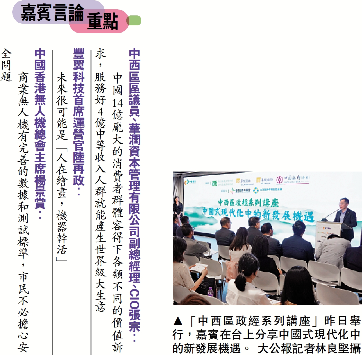 「中西觀點」─中國式現代化新發展機遇講座活動由中西區區議員張宗議員辦事處、中西區區議員吳然議員辦事處、華潤資本、華潤金融、中銀香港等駐港中資企業共同舉辦。