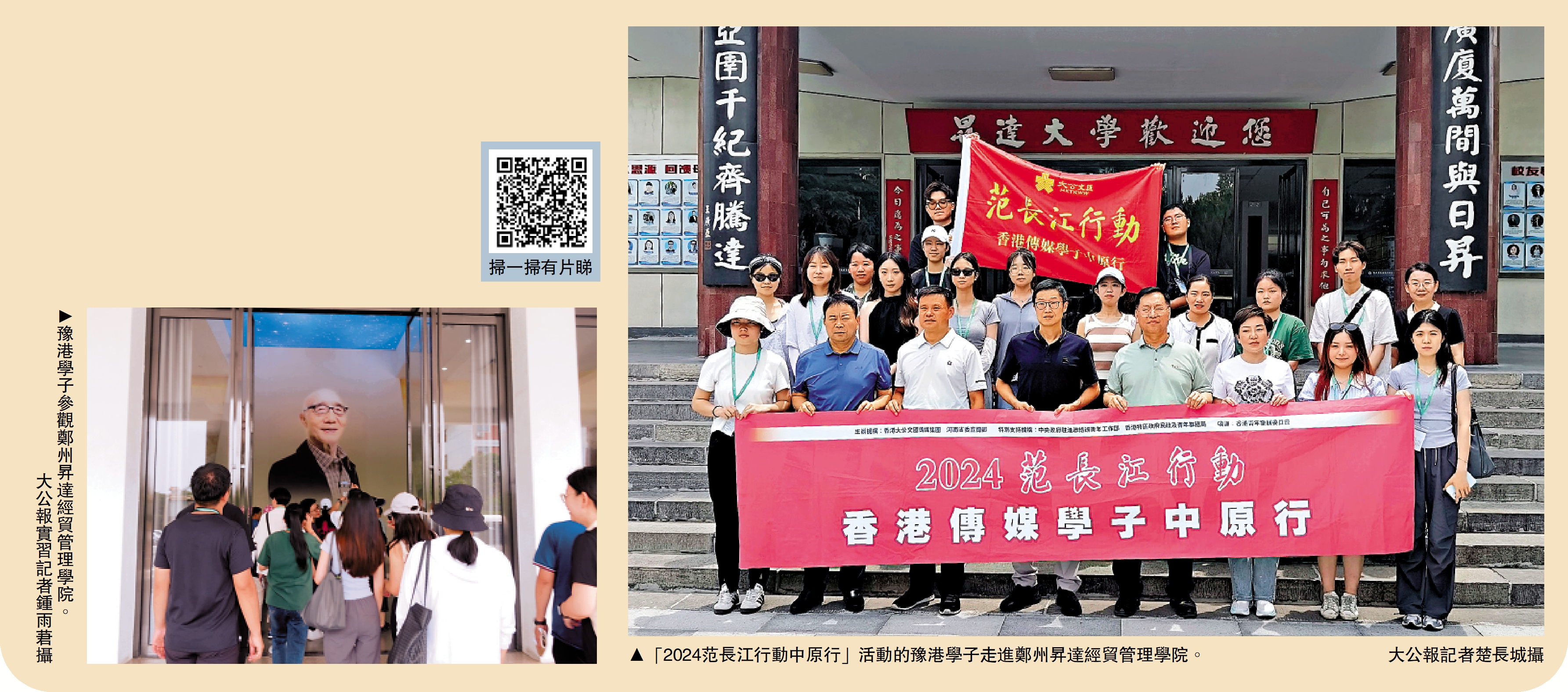 6月19日上午,「2024范長江行動中原行」的豫港學子來到鄭州昇達經貿管理學院(簡稱鄭州昇達)參觀,相繼走訪了圖書館、校史館等地,近距離了解該院校的學風與辦學理念,切身感受到了學校深厚的育人情懷。校史館中那行「露從今夜白,月是故鄉明」,成為了這份情懷的最佳註腳。鄭州昇達由豫籍台灣教育家王廣亞創辦,建校31年來,三代人「接力」堅守回饋桑梓、教育報國初心,積極推進兩岸教育文化交流。\大公報實習記者 羅倩昕、馬璟杭、彭伊璐