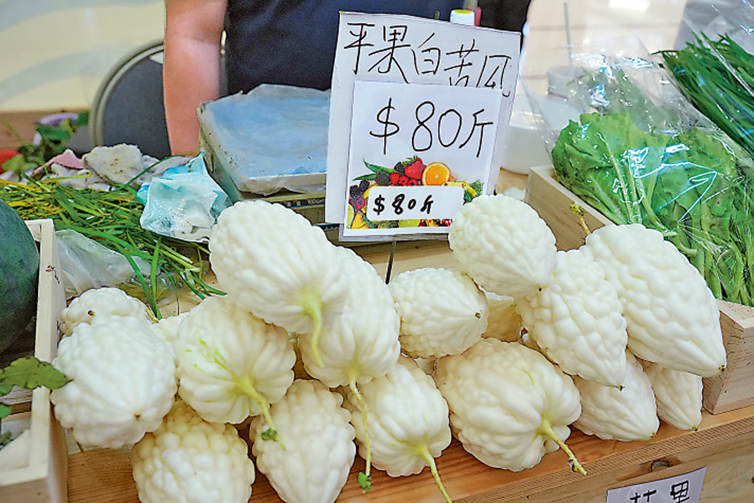 除了有機西瓜,農墟內的不同種類有機蔬果,包括可直接榨汁飲用的「蘋果白苦瓜」(見圖)、長身形的南瓜、大顆果肉的粟米、微辣清香的「牛角椒」等,吸引不少市民的青睞。