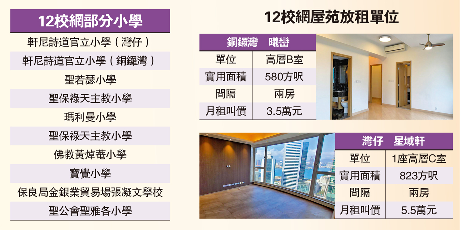 香港置業助理營業經理鄧若蘭表示,銅鑼灣希雲街38號曦巒入伙約10年,距離著名女校聖保祿天主教小學僅10餘分鐘步程,受家長客歡迎。屋苑現有約8伙放租,其中高層B室兩房戶,實用面積580方呎,享開揚景,月租叫價3.5萬元,實用呎租60元。另外,灣仔星街9號星域軒交通方便,亦受家長租客垂青,放租盤有1座高層C室兩房戶,實用面積823方呎,月租叫價5.5萬元,實用呎租67元。