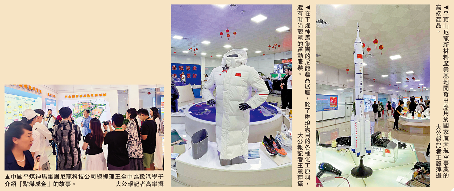 在河南省平頂山市這片「中原煤倉」上,一場「煤炭」變「黃金」的產業變革正悄然進行。曾經以煤炭為主導的平頂山,如今從煤這個「化工原料之母」破題發力,正依託尼龍新材料產業,實現華麗轉身。6月19日,「2024范長江行動中原行」的豫港學子探訪了平頂山尼龍新材料開發區,深刻感受到這座城市在新材料領域煥發出的勃勃生機。目前,平頂山正致力於建設世界一流千億級尼龍新材料產業基地,在尼龍生產技術上不斷攻堅突破,多項技術達國際領先水平,並開發應用於大飛機、神舟飛船等的高端產品,向着「深海、深空、深藍、深地」持續探索延伸。\大公報實習記者 馬林興