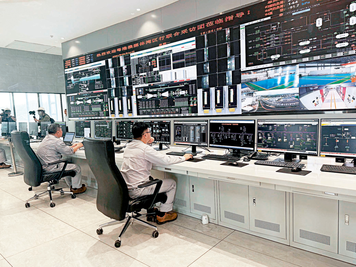 戴好安全帽,記者隨團進入到熱能發電廠的車間內部走訪。在花都熱電智能生產駕駛艙,記者看到全廠實時總負荷數據在不斷跳動,全廠供電氣耗率、光伏發電量等數據均在大屏幕上一覽無遺。而在另一個總控中心,三名工作人員則凝神監控着屏幕上密密麻麻的數據,保障燃機、汽機、鍋爐等設備正常運行。