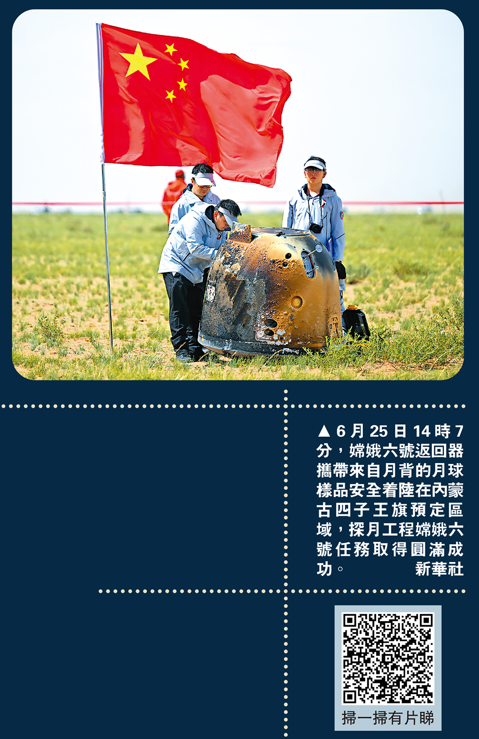 歷時53天、38萬公里的太空往返之旅,中國嫦娥六號取回人類第一抔來自月球背面的古老月壤平安返回地球!國家航天局宣布,2024年6月25日14時07分,嫦娥六號返回器準確着陸於內蒙古四子王旗預定區域,工作正常,標誌着探月工程嫦娥六號任務取得圓滿成功,實現世界首次月球背面採樣返回。後續,珍貴的月背樣品將空運至北京開艙,後續開展樣品儲存、分析和研究相關工作。未來,科研人員將對來自月球正面和背面的樣品開展對比研究,對於揭開月球演化歷史之謎有重大意義。\大公報記者 劉凝哲北京報道