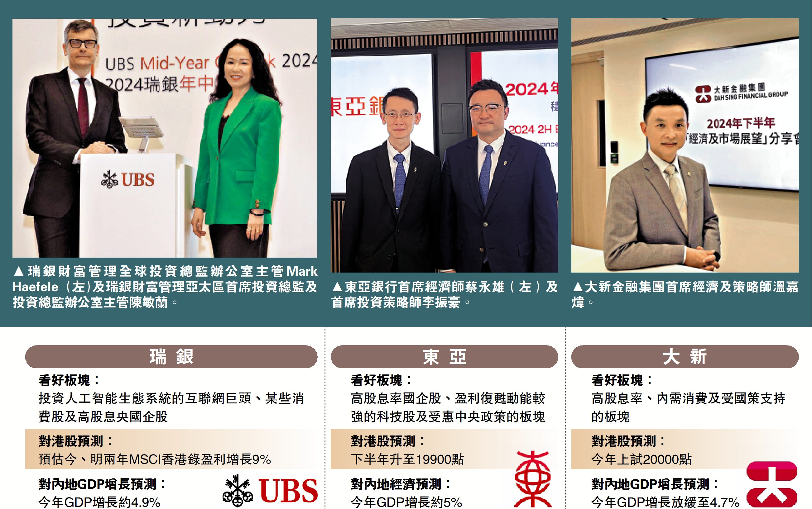 美國利率方面,Mark Haefele認為,由於通脹回落,料聯儲局將會減息,預計在9月首次減息0.25厘,隨後每個季度再減息0.25厘,預計到2025年減息1厘。他並稱,屆時現金可能會轉向其他資產,其中最看好債券,認為高品質債券會在下半年錄得較好回報。