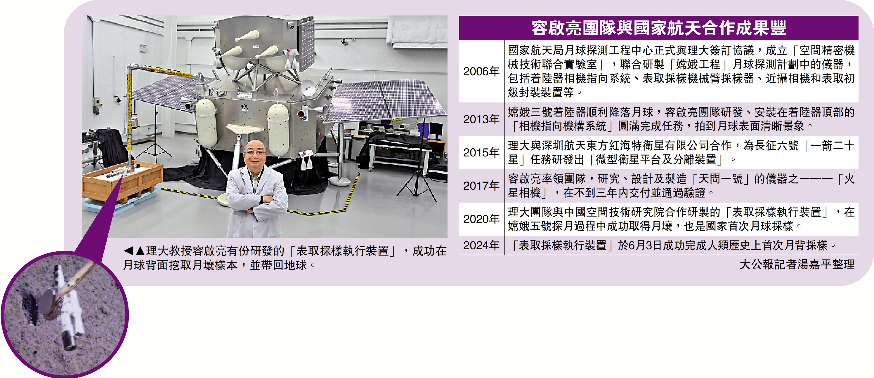 中國探月工程嫦娥六號探測器,歷史性完成人類首次月背採樣,於本周二(25日)返回地球着陸。今次的月壤採樣工作,由香港理工大學與中國空間技術研究院合作研製的「表取採樣執行裝置」完成。負責該裝置研發的理大鍾士元爵士精密工程教授容啟亮表示,感謝國家給予機會,讓團隊實現夢想,同時反映出國家非常信任香港的能力,盼望日後能參與更多項目。