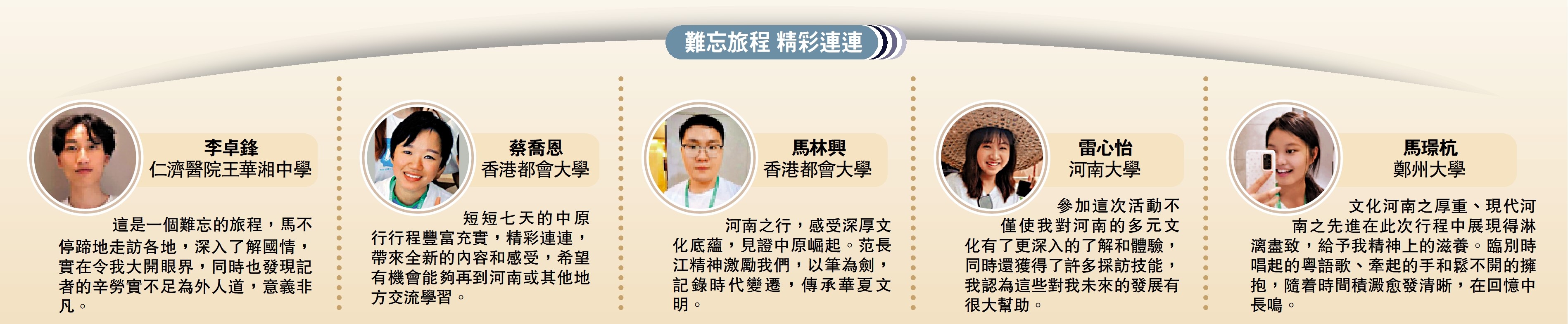 文化河南之厚重、現代河南之先進在此次行程中展現得淋漓盡致,給予我精神上的滋養。臨別時唱起的粵語歌、牽起的手和鬆不開的擁抱,隨着時間積澱愈發清晰,在回憶中長鳴。