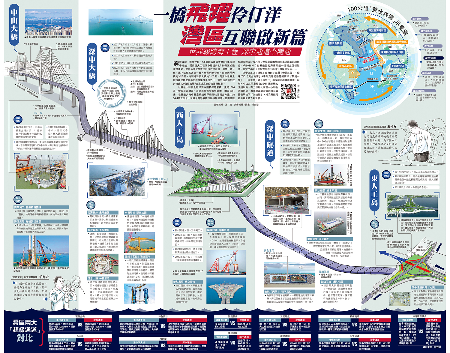 深中通道以「硬核」實力創下多項「世界之最」,給珠江口「黃金內灣」A字形交通網絡骨架再添「關鍵一橫」,「深莞惠」與「珠中江」兩大城市群跨海直連,深圳、中山之間車程由2小時縮短至30分鐘以內,有力推動大灣區一小時生活圈形成,為粵港澳大灣區融合高質量發展按下「加速鍵」,成為點燃灣區新質生產力新引擎。\責任編輯:王 旭 美術編輯、插畫:馮自培