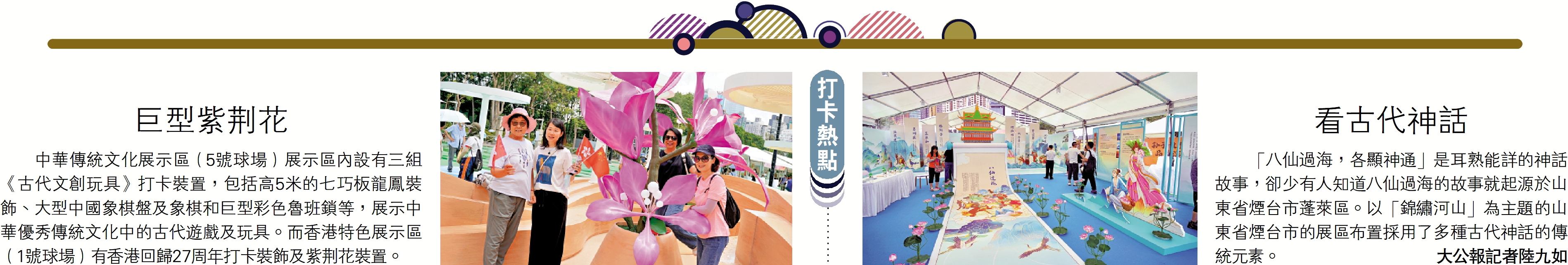 中華傳統文化展示區(5號球場)展示區內設有三組《古代文創玩具》打卡裝置,包括高5米的七巧板龍鳳裝飾、大型中國象棋盤及象棋和巨型彩色魯班鎖等,展示中華優秀傳統文化中的古代遊戲及玩具。而香港特色展示區(1號球場)有香港回歸27周年打卡裝飾及紫荊花裝置。