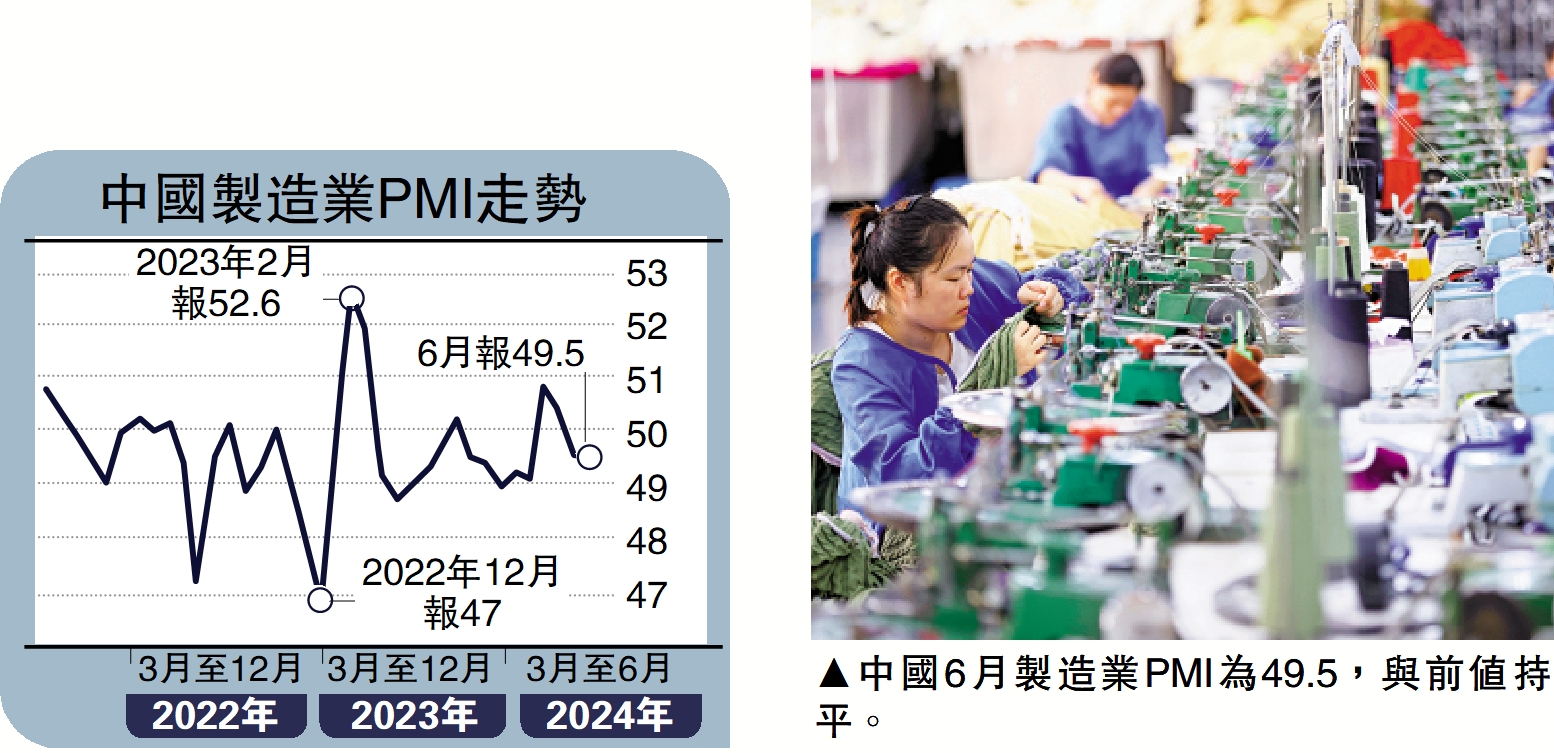 【大公報訊】記者倪巍晨上海報道:6月中國製造業採購經理指數(PMI)為49.5,與前值持平,符合市場預期。國家統計局服務業調查中心高級統計師趙慶河介紹,從產出看,中國經濟總體保持擴張,但持續回升向好基礎仍需鞏固。分析稱,今年上半年製造業PMI均值為49.8,較去年下半年均值提升0.3個百分點,預示中國經濟保持穩定恢復的主基調。考慮到當前內需端正持續回暖,加之宏觀政策效果的不斷顯現,7月製造業PMI有望向上改善。
