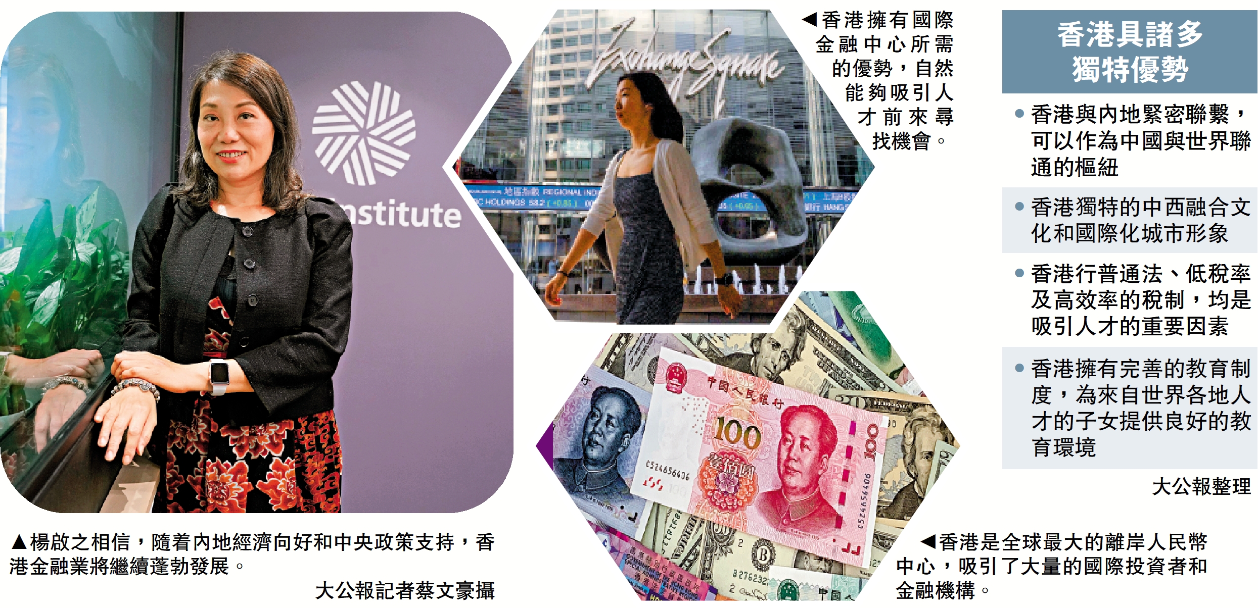 除工作及生活環境外,發展機遇亦是人才重視的因素之一。楊啟之指出,內地作為全球第二大經濟體,香港則是最大的離岸人民幣中心,自然吸引不少投資者投資及地區希望加強合作。「香港擁有豐富的金融專業人才,在開拓人民幣新產品、進行銷售和合規等方面具有豐富的經驗,對人才來說亦是很大的發展機遇。」