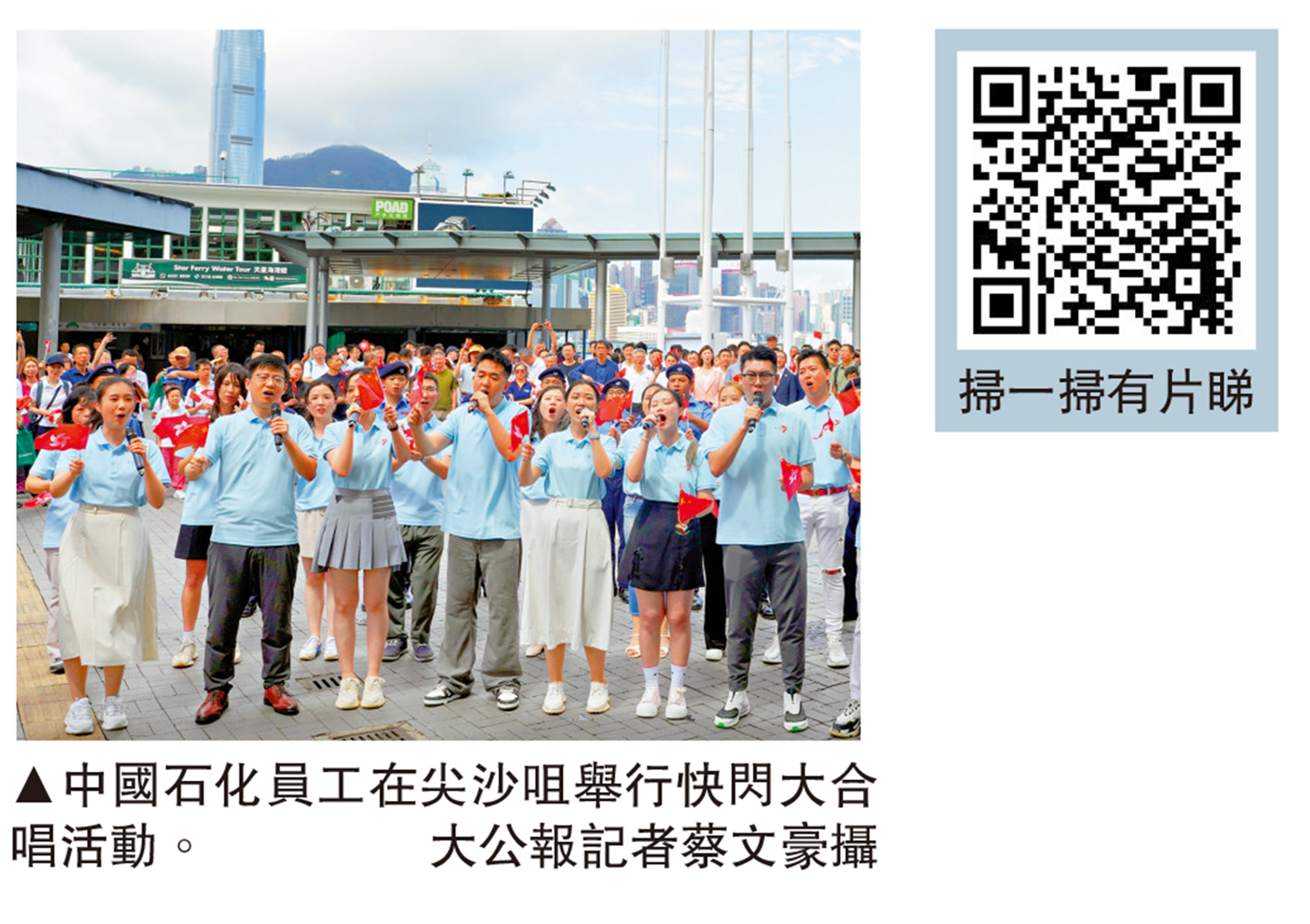 超過100位中國石化員工昨日快閃唱出三首經典歌曲,包括劉德華的《中國人》,還有《東方之珠》和《我愛你,中國》。雖說屬於業餘演唱,但他們的歌藝與合拍程度,絕對有專業水平。除中國石化員工,參與快閃大合唱活動的還包括駐港中資機構代表、立法會議員,以及本地學校學生。\大公報記者周寶森(視頻)