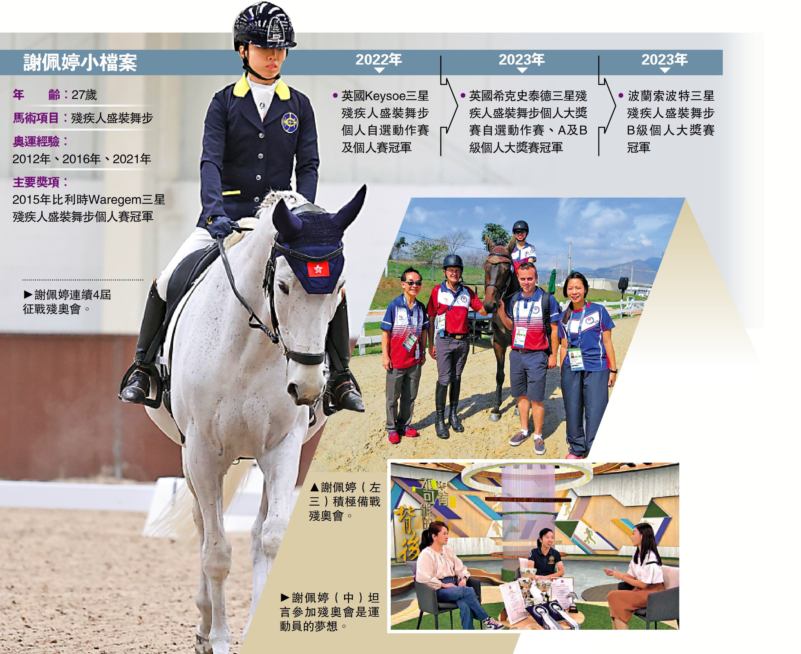香港賽馬會殘疾人馬術隊成員謝佩婷,獲中國香港殘疾人奧委會及中國香港馬術總會確認,將代表中國香港參與巴黎殘疾人奧運會,出戰馬術盛裝舞步個人項目,是次獲選亦是她個人連續4屆參與殘奧會。