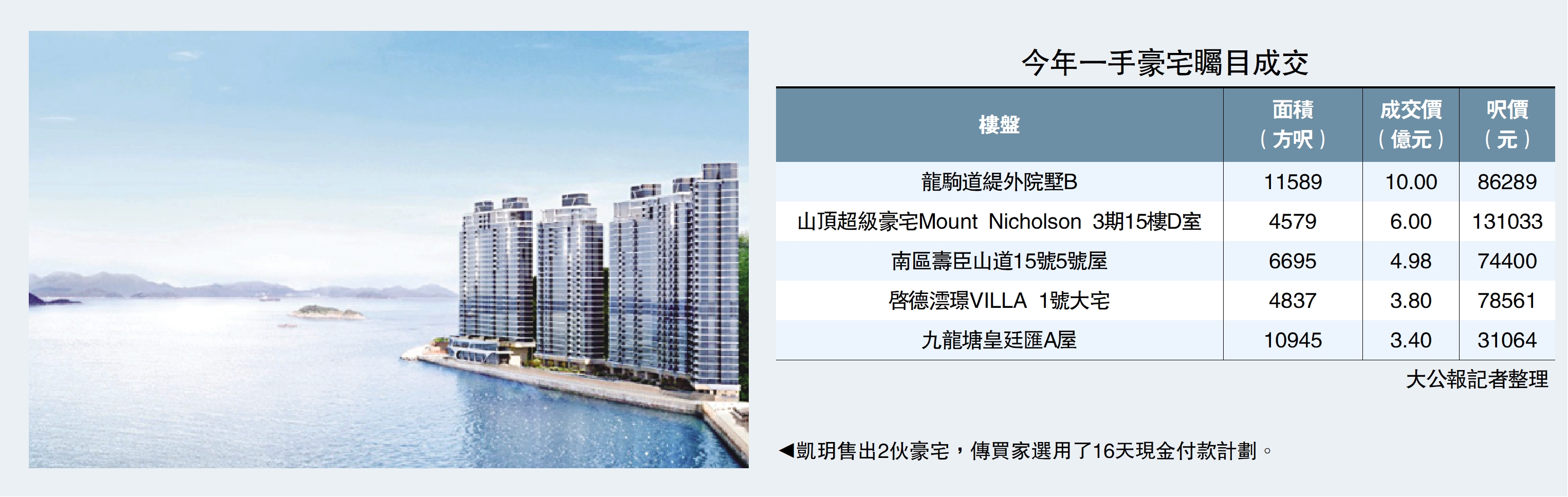 隨着本港全面撤辣,刺激內地客南下掃豪宅意欲,今年本港豪宅表現勇猛。據一手成交紀錄冊顯示,龍光集團(03380)及合景泰富(01813)合資的鴨脷洲凱玥,昨日以逾2.5億元售出2伙同層毗鄰單位。消息指,疑似是由一內地客大手筆買入,此外,買家選用了16天現金付款計劃,即是須於簽署臨時買賣合約16日後完成交易,如此短的成交期與full pay無異,可見買家對本港樓市充滿信心。\大公報記者 連風